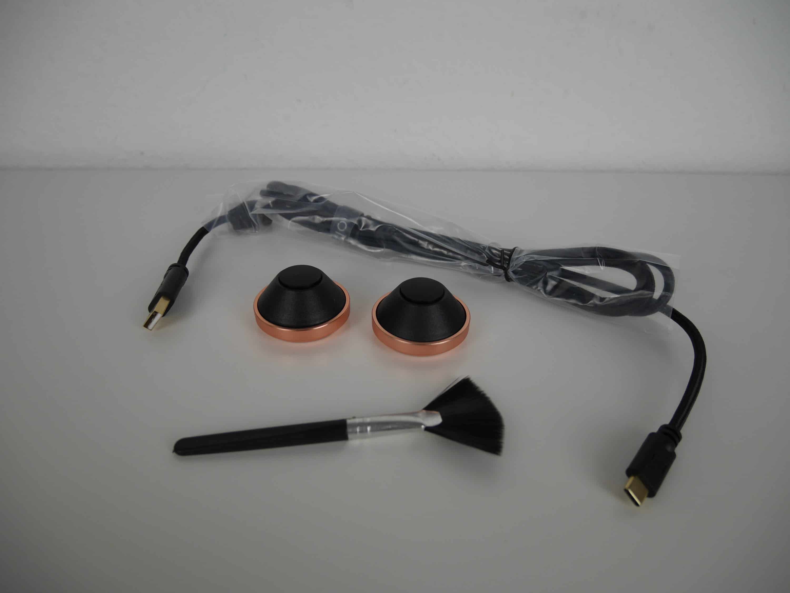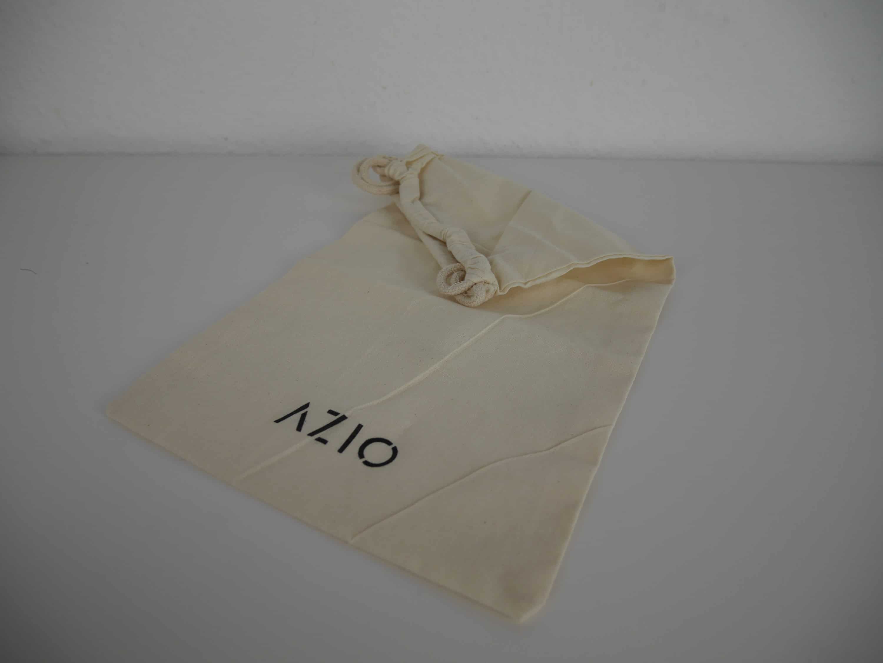 Im Lieferumfang befindet sich neben der eigentlichen Tastatur noch eine Handballenauflage, ein Stoffbeutel zum Transport, eine Plastikabdeckung zum Schutz vor Staub sowie ein optional nutzbares USB-Kabel, das zur Verbindung mit einem Computer und zum Aufladen des integrierten Akkus genutzt werden kann. Außerdem legt Azio noch einen Reinigungspinsel bei, um die Tastatur von Staub zu befreien. Zwei zusätzliche Standfüße, die gegen die vormontierenden Ständer der Tastatur ausgetauscht werden können, ermöglichen eine Verstellung der Höhe.