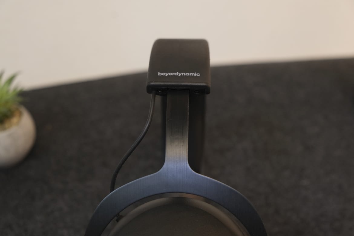 Von den Muscheln aus gehen robuste Aluminium-Halterungen, sowie ein flexibles Kabel auf beiden Seiten in den Kopfbügel über. An der Innenseite des Kopfbügels finden wir eine Anzeige der Größeneinstellung in Form verschieden großer Punkte, die eine Feinjustierung in insgesamt zehn Stufen ermöglicht.