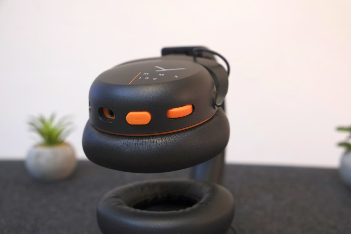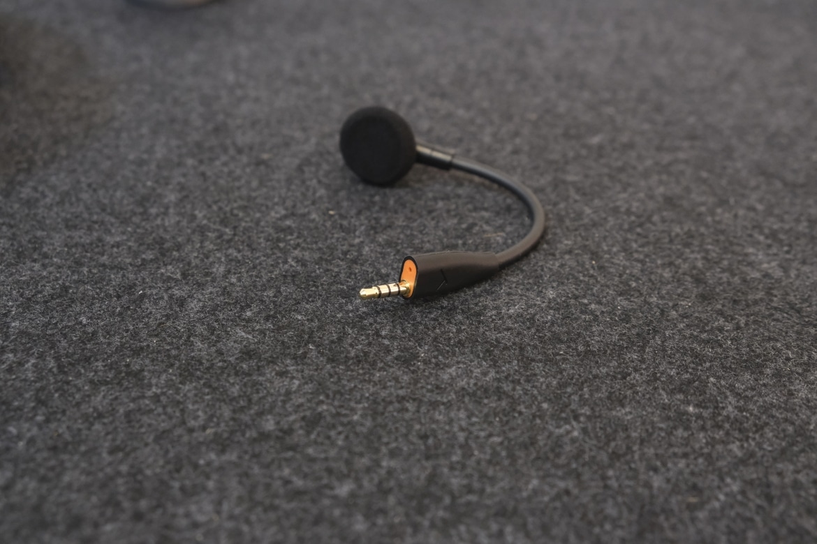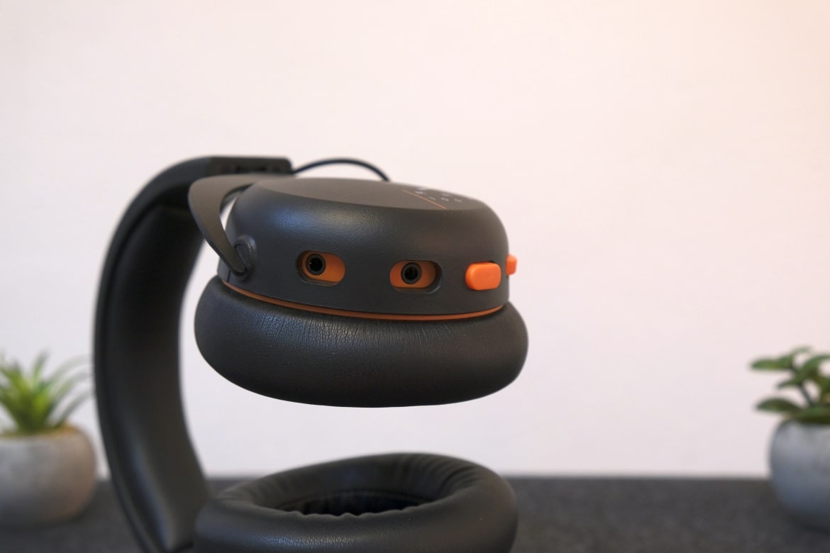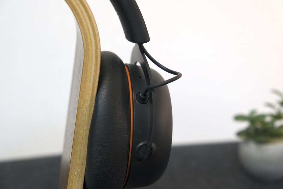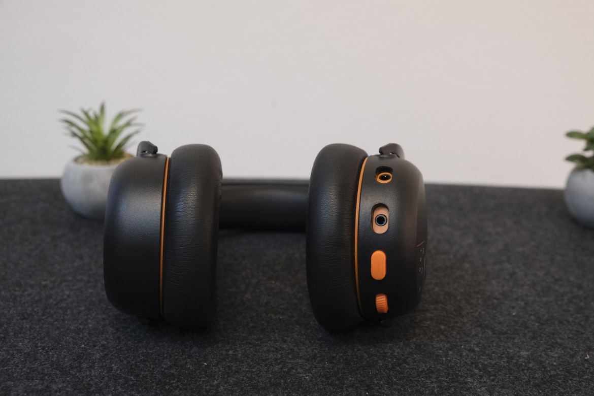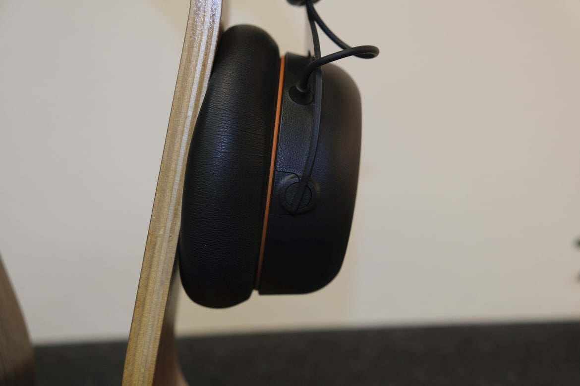 Direkt beim ersten Blick stechen die orangefarbenen Details ins Auge. Einerseits in Form einer kleinen Umrandung zwischen Ohrmuschel und -polster, anderseits im Bereich der Bedienelemente und Anschlüsse. Diese sind allesamt an der Unterseite der linken Ohrmuschel positioniert und setzen sich (von vorne nach hinten) aus Mikrofonanschluss, Klinkenanschluss, Mute-Button und Lautstärkerad zusammen.