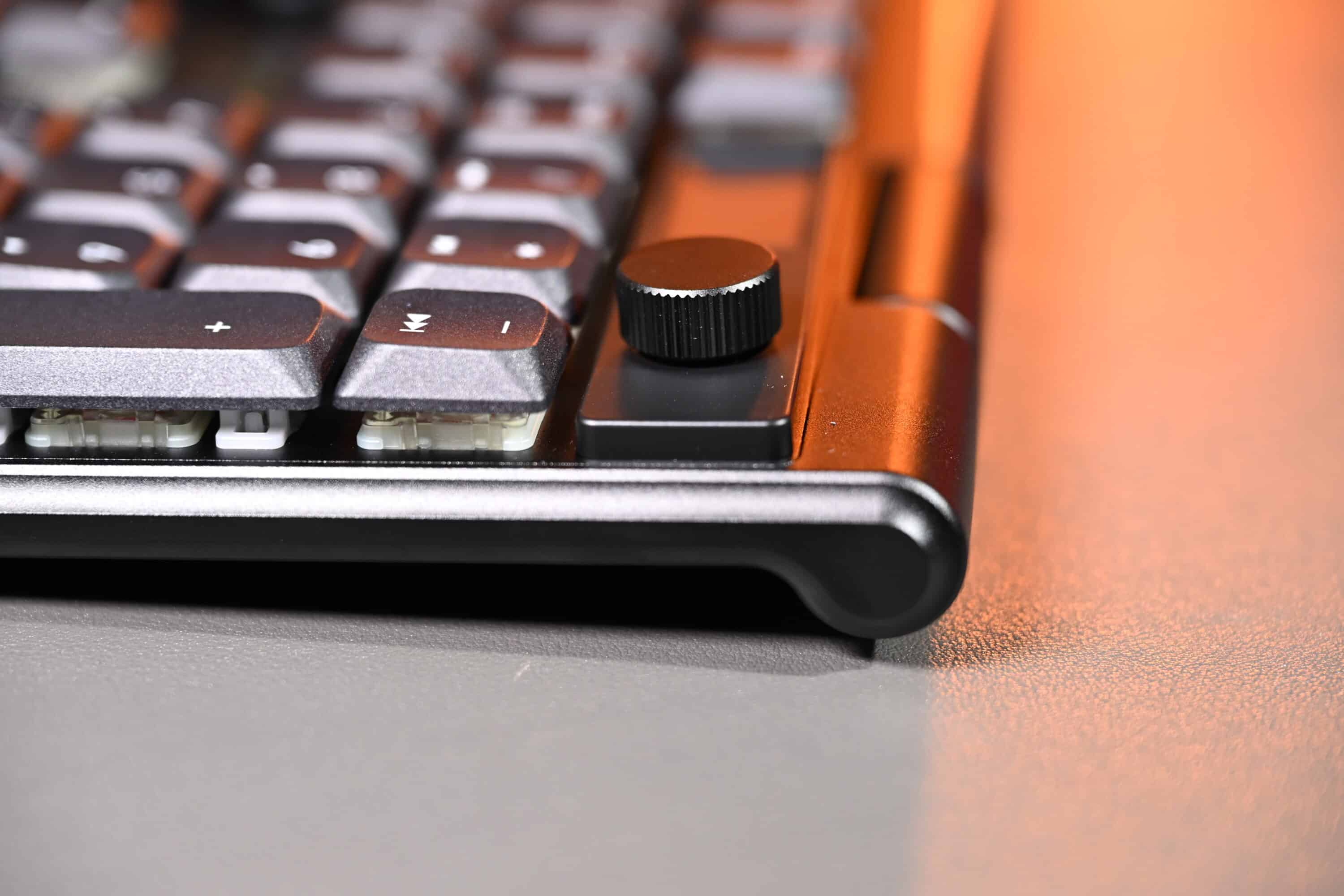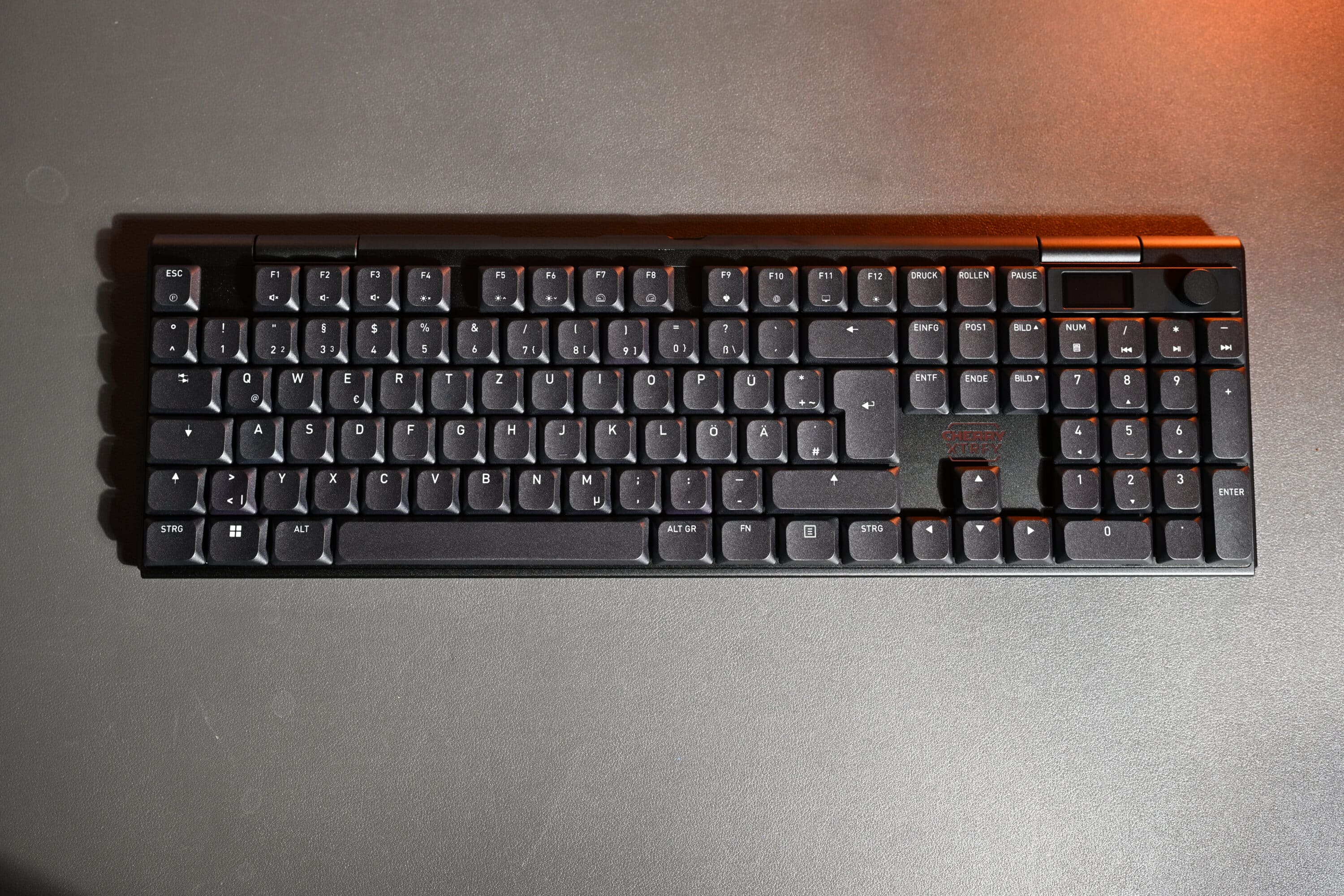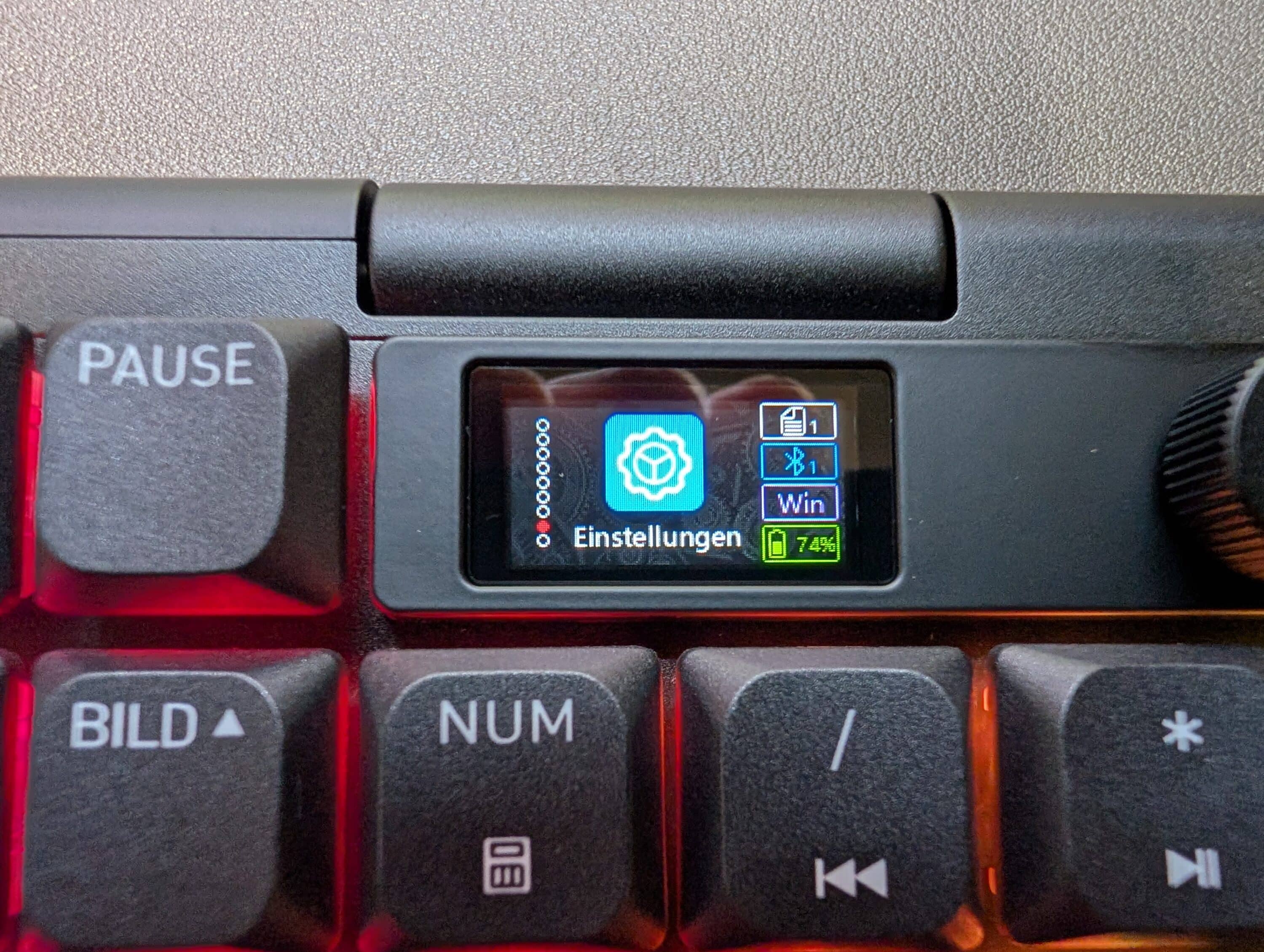 Auffällige Elemente sind vor allem das Drehrad und Display, die am rechten oberen Rand der Tastatur beheimatet sind. Das Display ist etwas kleiner als im Falle der CHERRY XTRFY MX 8.3 TKL (unser Test), wartet aber mit demselben Aufbau und Design auf.