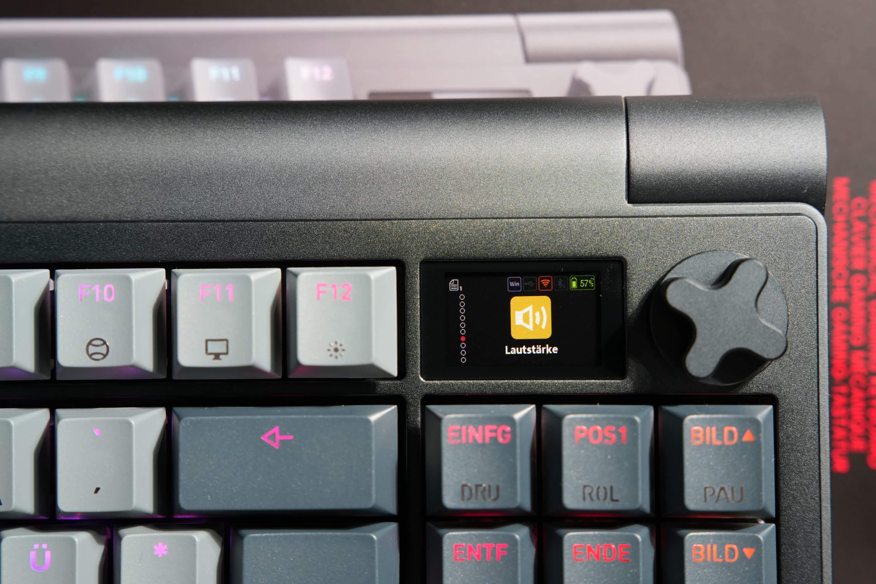 Auf den ersten Blick stechen dabei optisch vor allem drei Details ins Auge. Das erste ist das LC-Display rechts von der F12-Taste, das mit einem individuellen Logo ausgestattet werden kann und Einstellungen der Tastatur ohne Software ermöglicht. Ein Feature, das wir beispielsweise bereits aus der be quiet! Dark Mount (unser Test) kennen. Mit dem Unterschied, dass das Display bei CHERRY XTRFY wesentlich kleiner ausfällt und die Bilddarstellung wesentlich niedriger aufgelöst ausfällt.