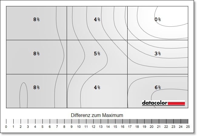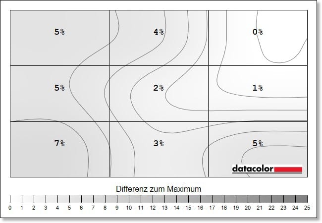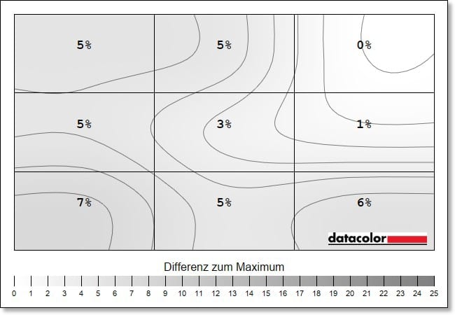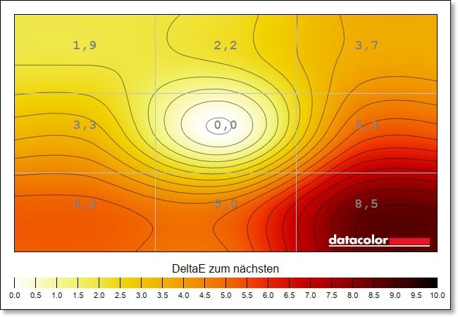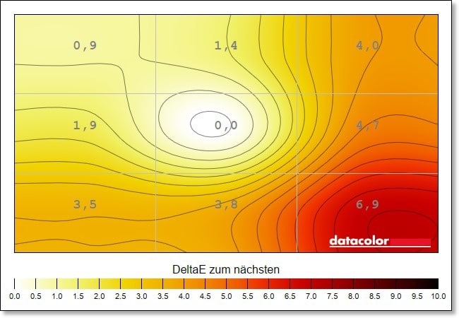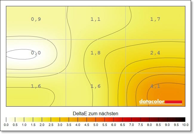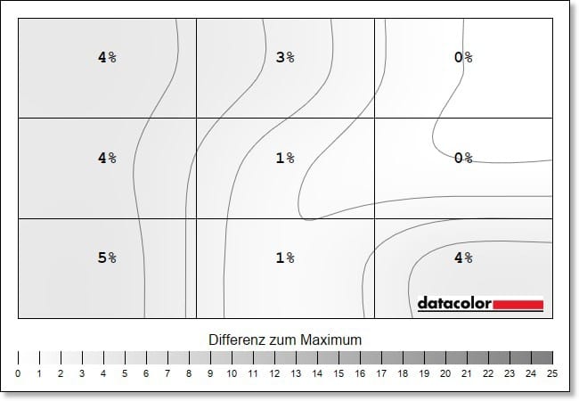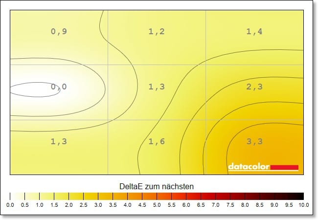 Leichte Schwächen zeigen sich bei der Farb-Homogenität, also der Ausgeglichenheit der Farbdarstellung über den gesamten Bildschirm. Hier gibt es, vor allem auf maximaler Helligkeit, eine Abweichung von DeltaE 8,5 im unteren rechten Eck die abnimmt, je niedriger die Helligkeit eingestellt wird. Das sind schon recht hohe Werte, selbst deutlich günstigere Displays liefern hier bessere Resultate.