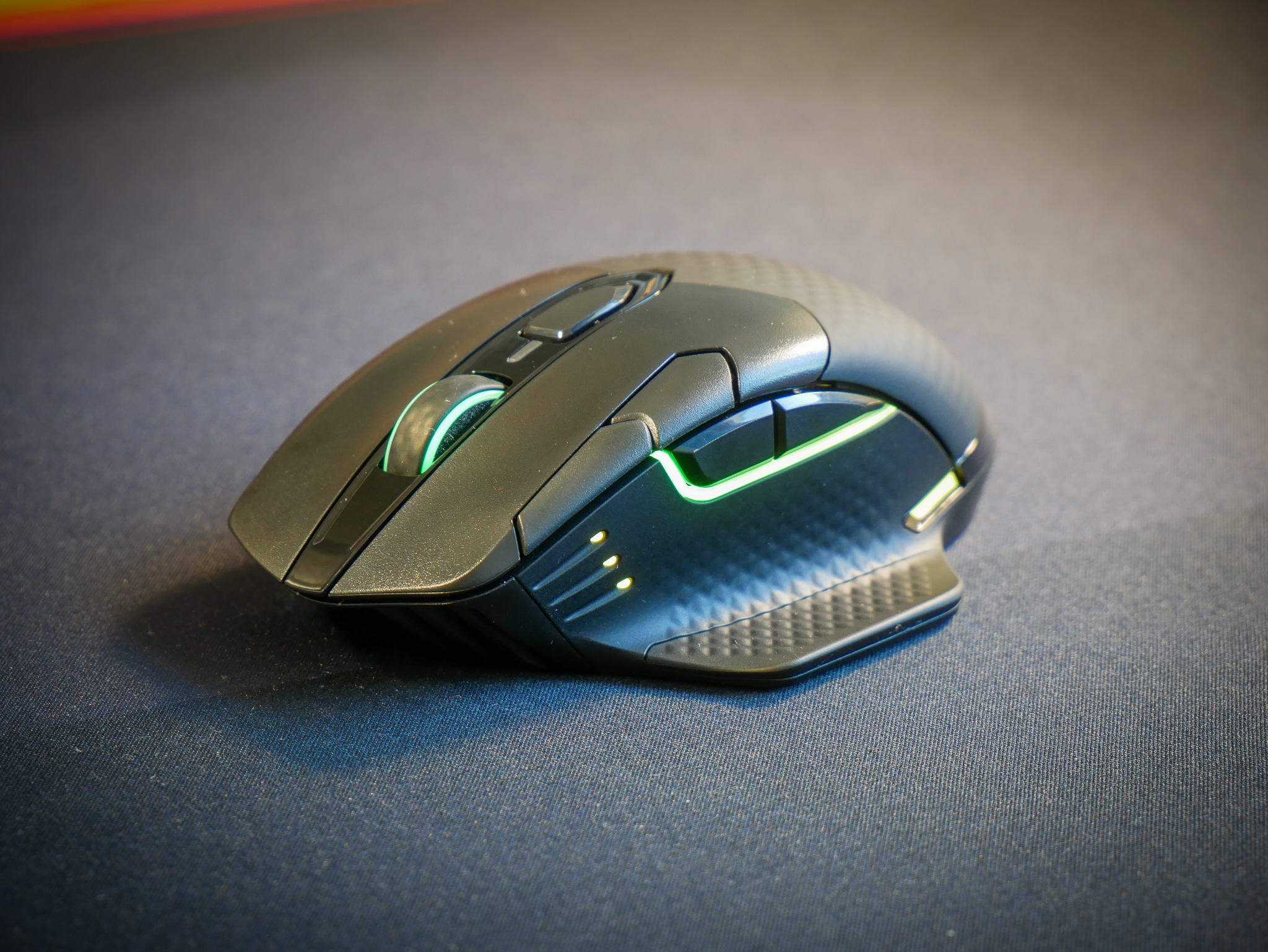Mit der 9-Zonen-RGB-Beleuchtung kann man seine Wireless-Maus noch mehr personalisieren. Dabei sind das Scrollrad, mehrere Leuchtleisten auf der linken Seite, das Corsair-Logo, eine Leiste auf der rechten Seite sowie die DPI- und Profil-LED-Indikatoren individuell einstellbar.