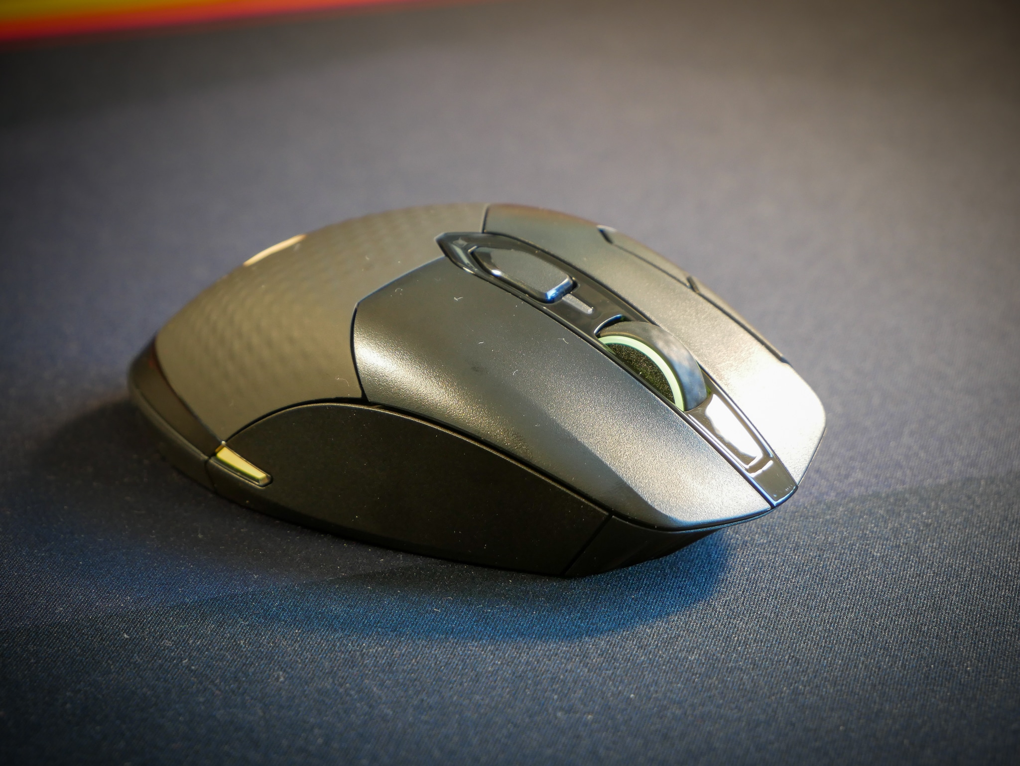 Mit ihren acht frei programmierbaren Tasten ist die Corsair Dark Core RGB Pro ordentlich ausgestattet. Links befinden sich zwei Tasten, die sich leicht mit dem Daumen bedienen lassen. Die Oberseite beherbergt neben den zwei Standardmaustasten links zwei weitere Tasten. Diese sollen mit dem Zeigefinger bedient werden, was sich aber leider als nicht ganz einfach herausgestellt hat. Deren Positionierung ist leicht ungünstig, so dass man den Finger etwas umständlich halten muss um an Beide heran zu kommen. Standardmäßig sind die Schalter für die Steuerung der DPI-Presets zuständig. Praktisch zu erwähnen ist hier, dass man dank der zwei Taster nicht durch alle Einstellungen durchschalten muss, sondern bewusst die DPI-Zahl erhöhen oder verringern kann. Mittig krönt eine weitere Taste die Maus. Ab Werk werden so die auf der Dark Core RGB Pro gespeicherten Profile gewechselt.