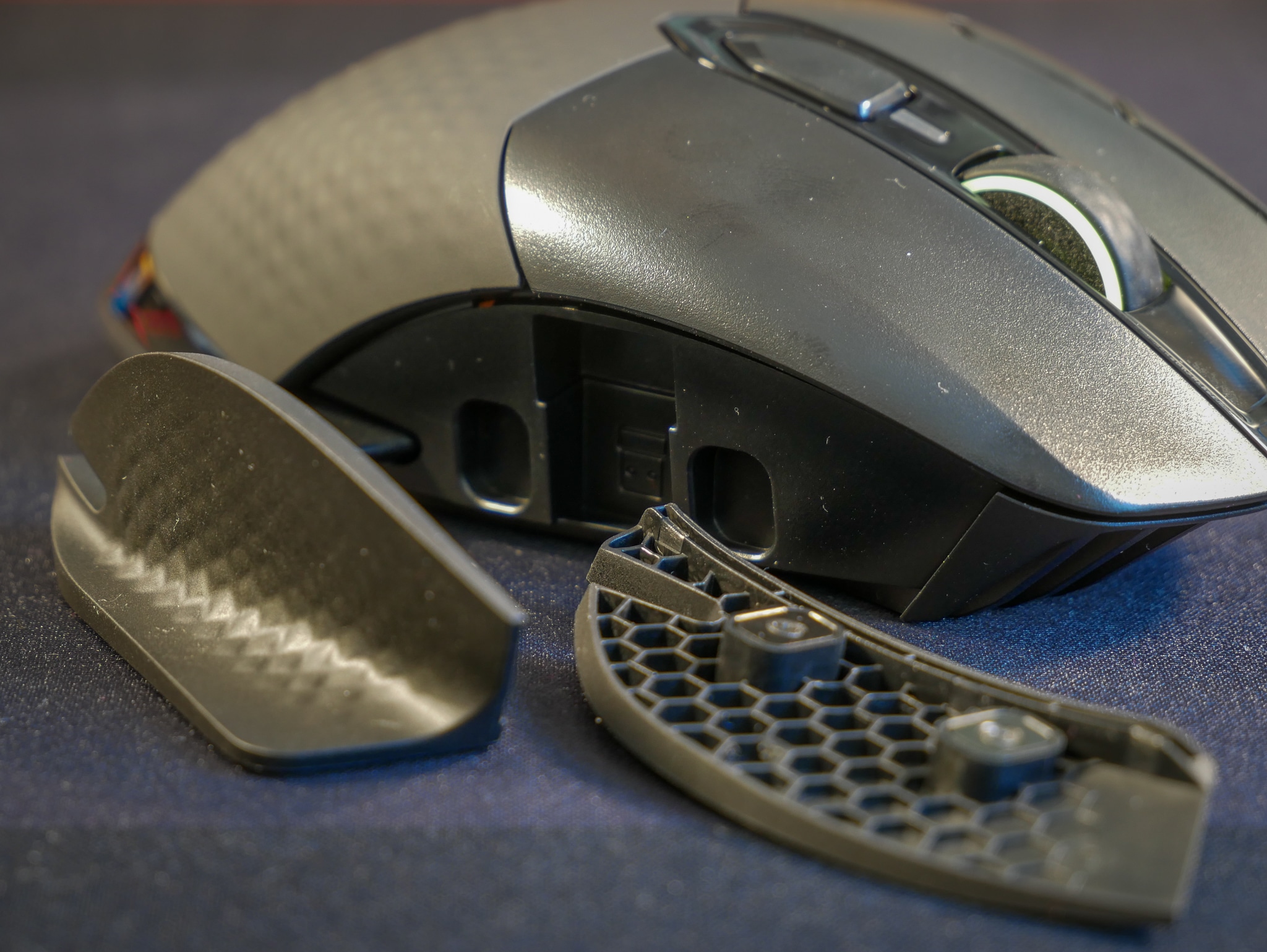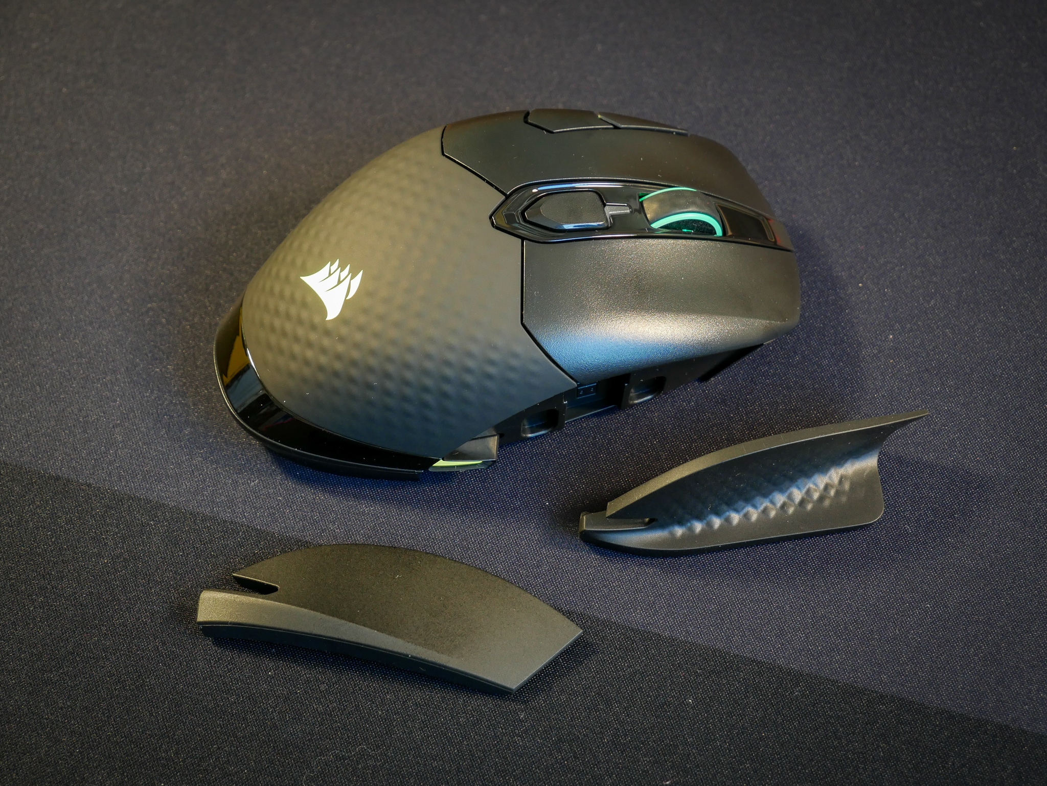 Wenn man sich die Dark Core RGB Pro anschaut, merkt man sofort, wieviel Arbeit Corsair in die Entwicklung der Form der High-End-Gaming-Maus gesteckt hat. Wenn man seine Hand auf sie auflegt, spürt man das sogar. Egal ob Palm oder Claw, diese Maus ist für unterschiedliche Griff-Typen sorgfältig geformt worden. Optisch auffallend ist der Side-Grip auf der linken Seite, worauf der Daumen abgelegt werden kann. So braucht er nicht immer die Maus zu umklammern und schleift auch nicht auf dem Mauspad. So wird unnötiger Drag verhindert. Bei Bedarf kann man auf der rechten Seite auch einen Grip anbringen. Dieser hält magnetisch und ist so schnell und einfach austauschbar.