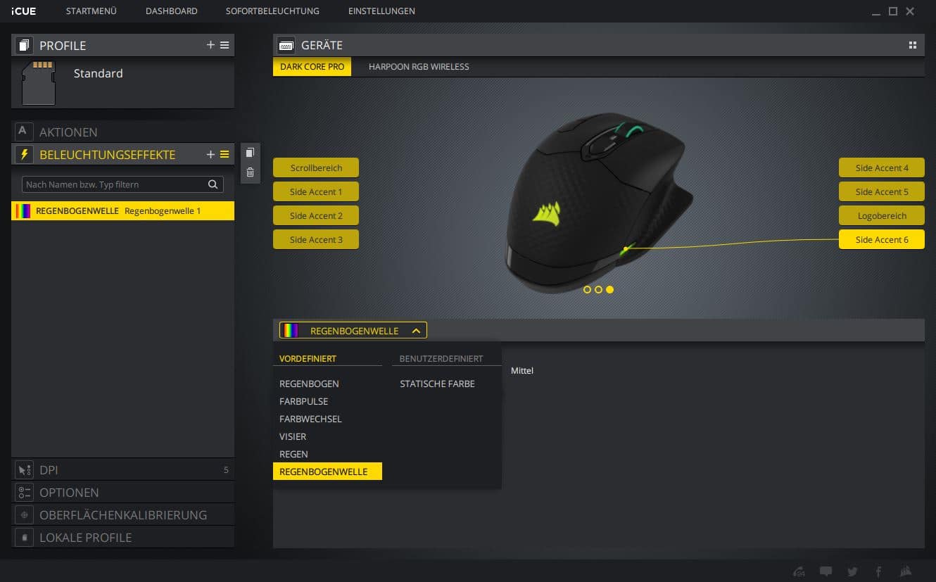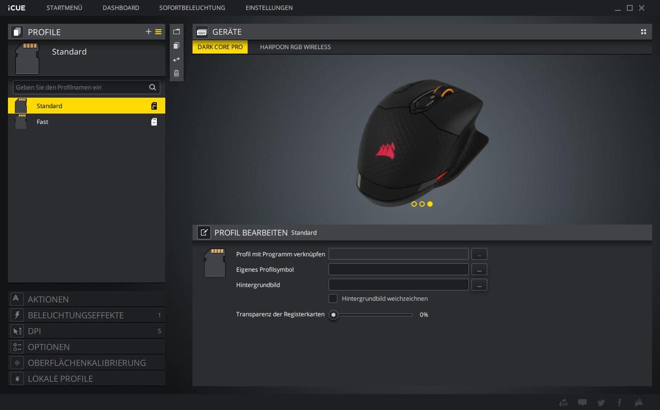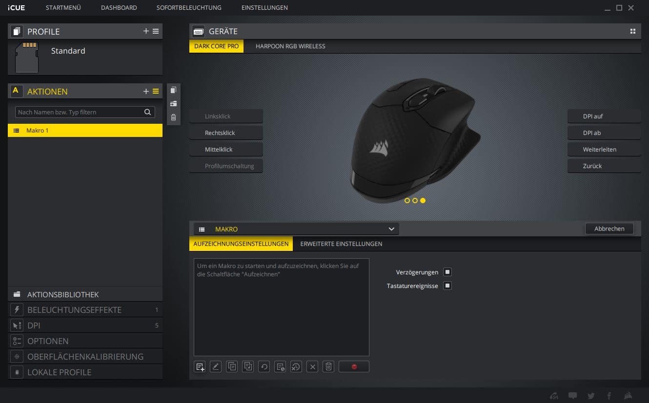 Auf alle unterschiedlichen Einstellungen kann man auf der linken Seite des iCUE-Fensters zugreifen. Unter „Aktionen“ kann man Makros erstellen und zuweisen oder z. B. andere Tasten der Tastatur remappen. Im Reiter „Beleuchtungseffekte“ lässt sich die Neun-Zonen-RGB-Beleuchtung nach belieben variieren. Ob Regenbogeneffekt, ein einfacher Farbwechsel oder pulsierende Farben, alles kann individuell angepasst werden. In der „DPI“ Sektion wird die Empfindlichkeit der Maus eingestellt. Dabei kann man mehreren Presets Werte von 100 bis 18.000 DPI zuweisen. Für jedes Preset ist sogar eine Farbe wählbar, in der dann die DPI-LEDs auf der linken Seite der Corsair Dark Core RGB Pro entsprechend leuchten. Super ist auch die „Oberflächenkalibrierung“, mit der man den Sensor der Maus auf den aktuellen Untergrund perfekt abstimmen kann. Alle Einstellungen können auch direkt auf der Maus in drei Profilen gespeichert werden. Somit entfällt lästiges neu konfigurieren, egal an welchem Computer man sich befindet. Und dank der drei Profilspeicher hat man für jede Situation immer eine passende Einstellung dabei.