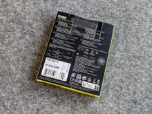 Die externe SSD kommt in einem kompakten schwarzen Karton mit gelben Akzenten. Auf der Vorderseite ist die SSD gut sichtbar abgebildet ist, zudem verweist man auf den USB-C-Anschluss, die Lese- und Schreibgeschwindigkeit sowie die Kapazität. Auf der Rückseite finden wir weitere Informationen, unter anderem zum Lieferumfang und der Garantie.