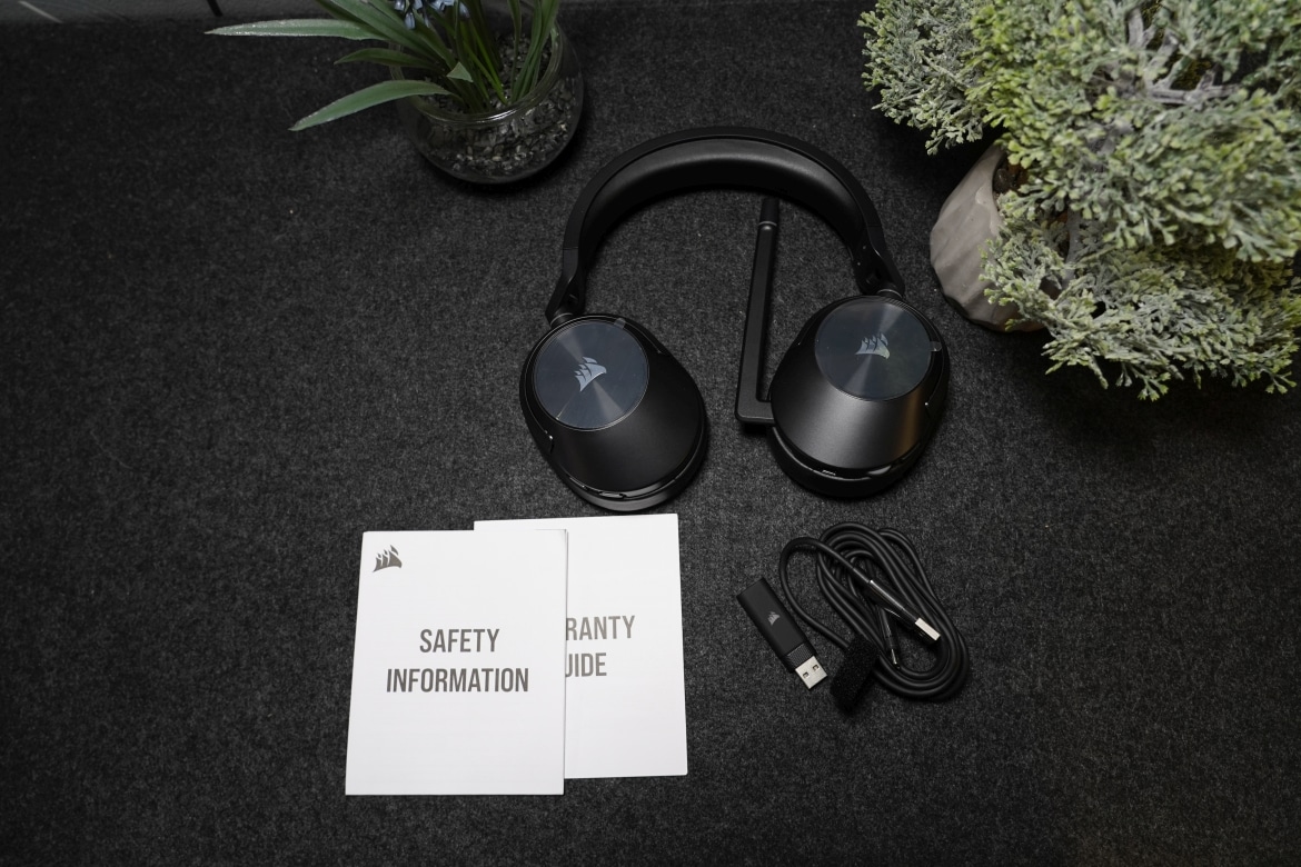 Im Inneren finden wir, neben dem Headset selbst, den beleuchteten USB-A-Wireless-Receiver, sowie ein zwei Meter langes USB-A- auf USB-C-Ladekabel. Sicherheits- und Garantiehinweise runden den Lieferumfang ab, auf eine Anleitung verzichtet Corsair – die benötigst du aber auch wirklich nicht, denn die Nutzung ist selbsterklärend.