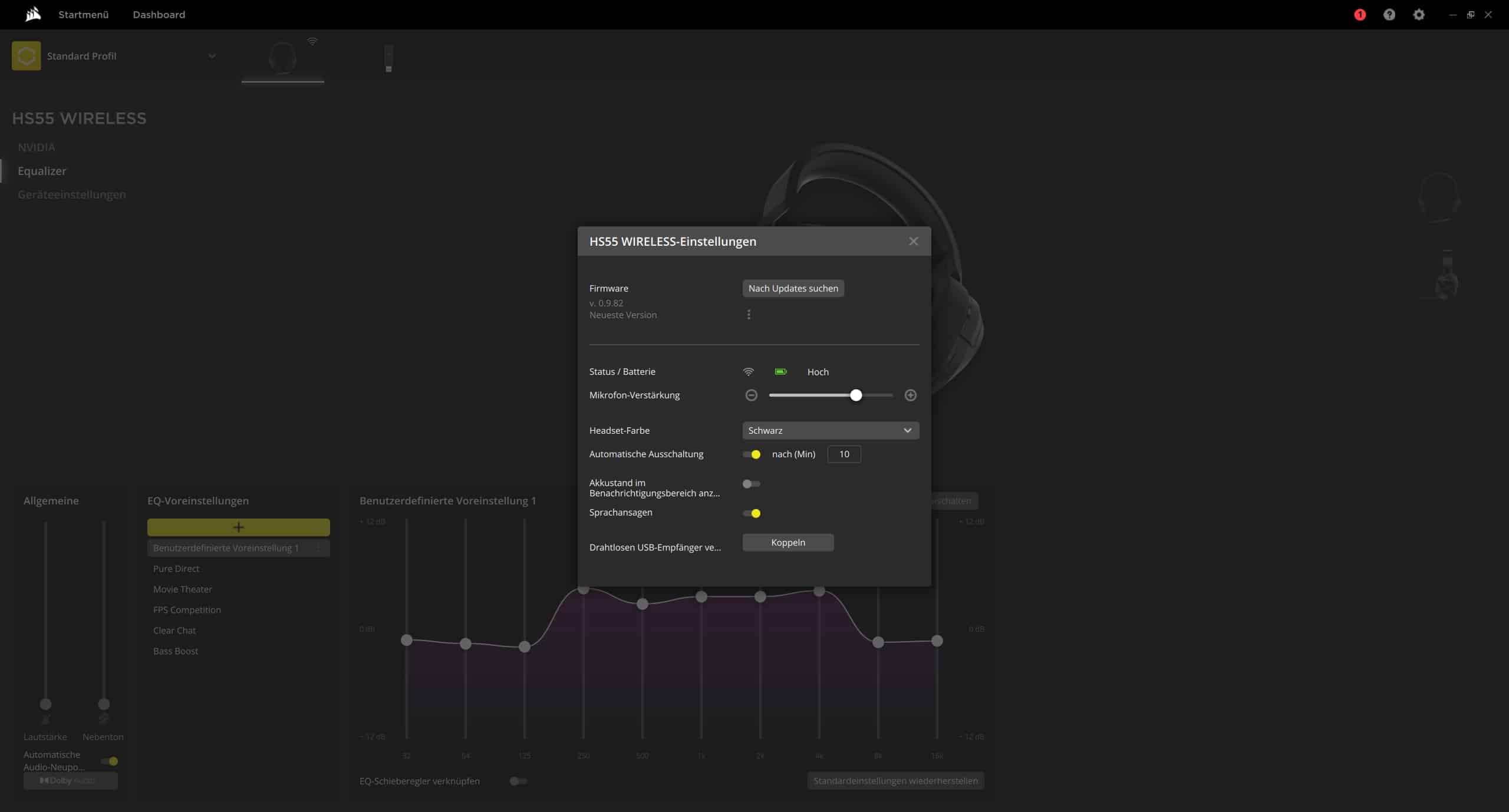 Unter den Geräteeinstellungen besteht die Möglichkeit, die Firmware zu aktualisieren, die Mikrofon-Verstärkung hinzuzuschalten oder beispielsweise einzustellen, wann sich das Corsair HS55 Wireless bei Nichtnutzung automatisch ausschalten soll.