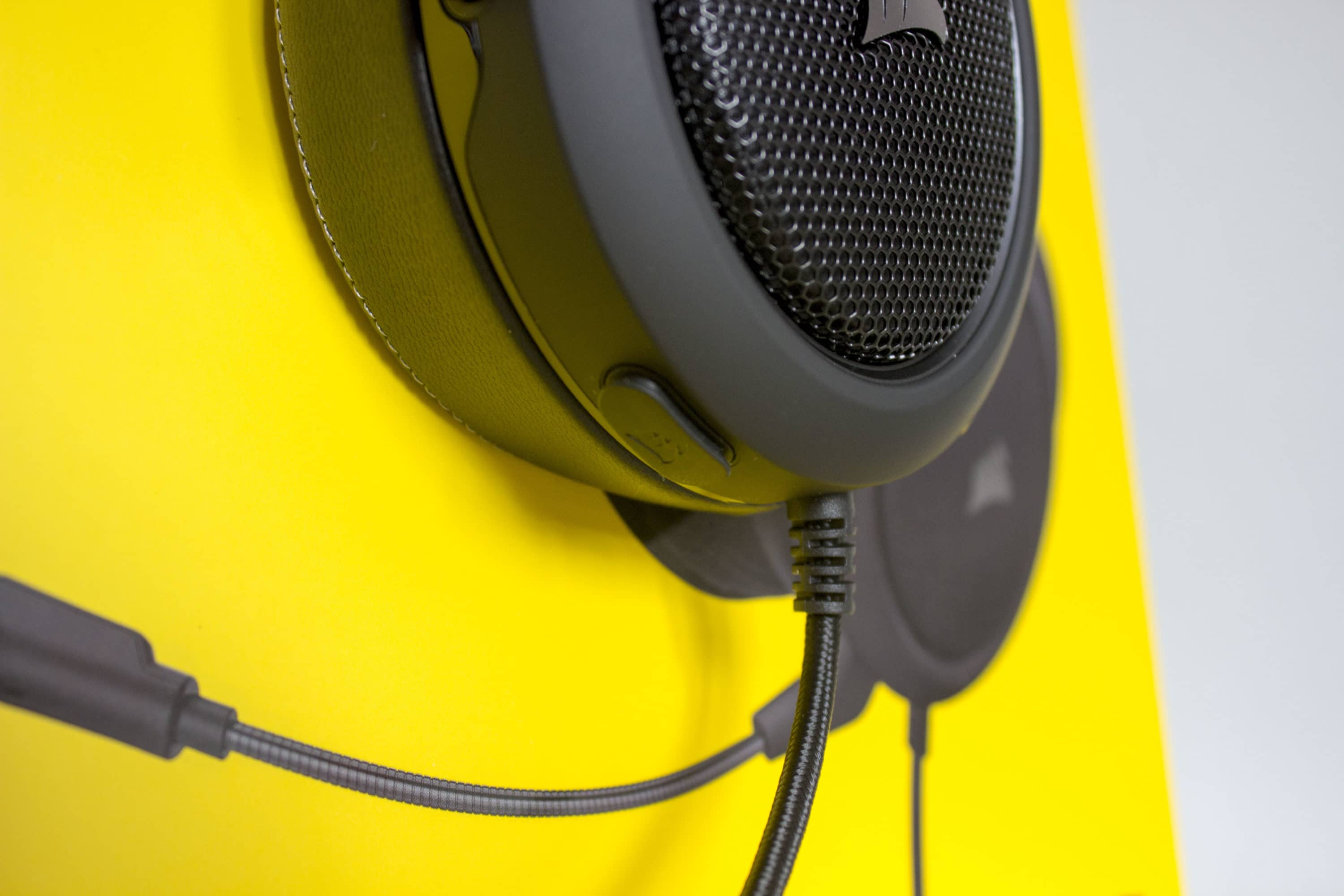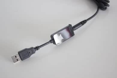 Die Steuerelemente begrenzen sich auf einen Knopf zum Aktivieren/Deaktivieren des Mikrofons und einen Lautstärkeregler. Auch das Anschlusskabel ist an der linken Ohrmuschel befestigt. Das gesleevte Kabel ist zwei Meter lang und besitzt einen kombinierten 3,5-mm-Klinken-Anschluss. Somit kann das HS60 Pro von so gut wie jedem Gerät verwendet werden. Für den PC ist eine USB-Soundkarte mit dabei, die auch virtuellen 7.1-Surround-Sound erzeugt. Über Corsairs iCUE-Software kann die Option aktiviert/deaktiviert werden.