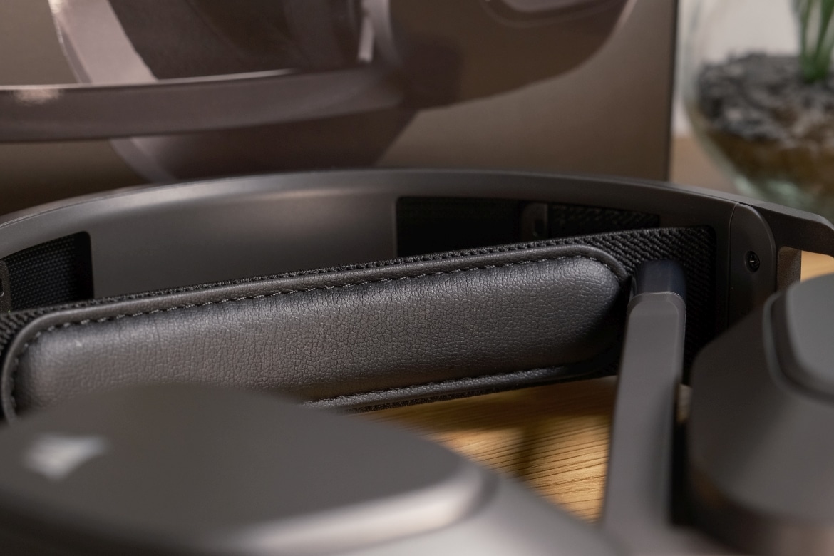 Das wartet mit einer Lederpolsterung auf und wird durch einen festen Klettverschluss am Bügel montiert. So passt sich das Headset flexibel der eigenen Kopfform an. Etwas ungewöhnlich, funktioniert in der Praxis aber tadellos und sorgt für einen sicheren Sitz des Headsets.