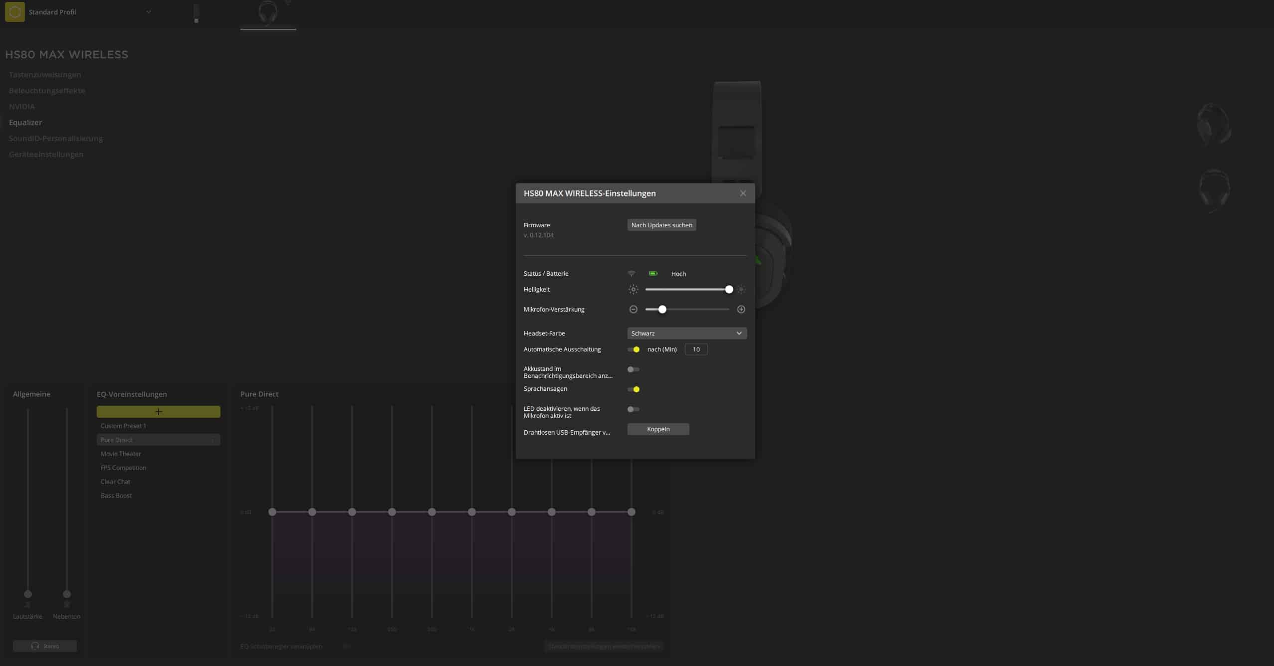 Mit aktiver RGB-Beleuchtung reduziert sich die Laufzeit allerdings deutlich und zwar auf 24 Stunden. Standardmäßig ist in der Software eine automatische Abschaltung bei Nichtgebrauch eingestellt. So schaltet sich das HS80 Max nach 10 Minuten von selbst aus, wer mag, kann das aber auch deaktivieren. Die Wireless-Reichweite ist ebenfalls tadellos, 15 Meter und mehr sind in Innenräumen selbst bei dicken Wänden kein Problem.
