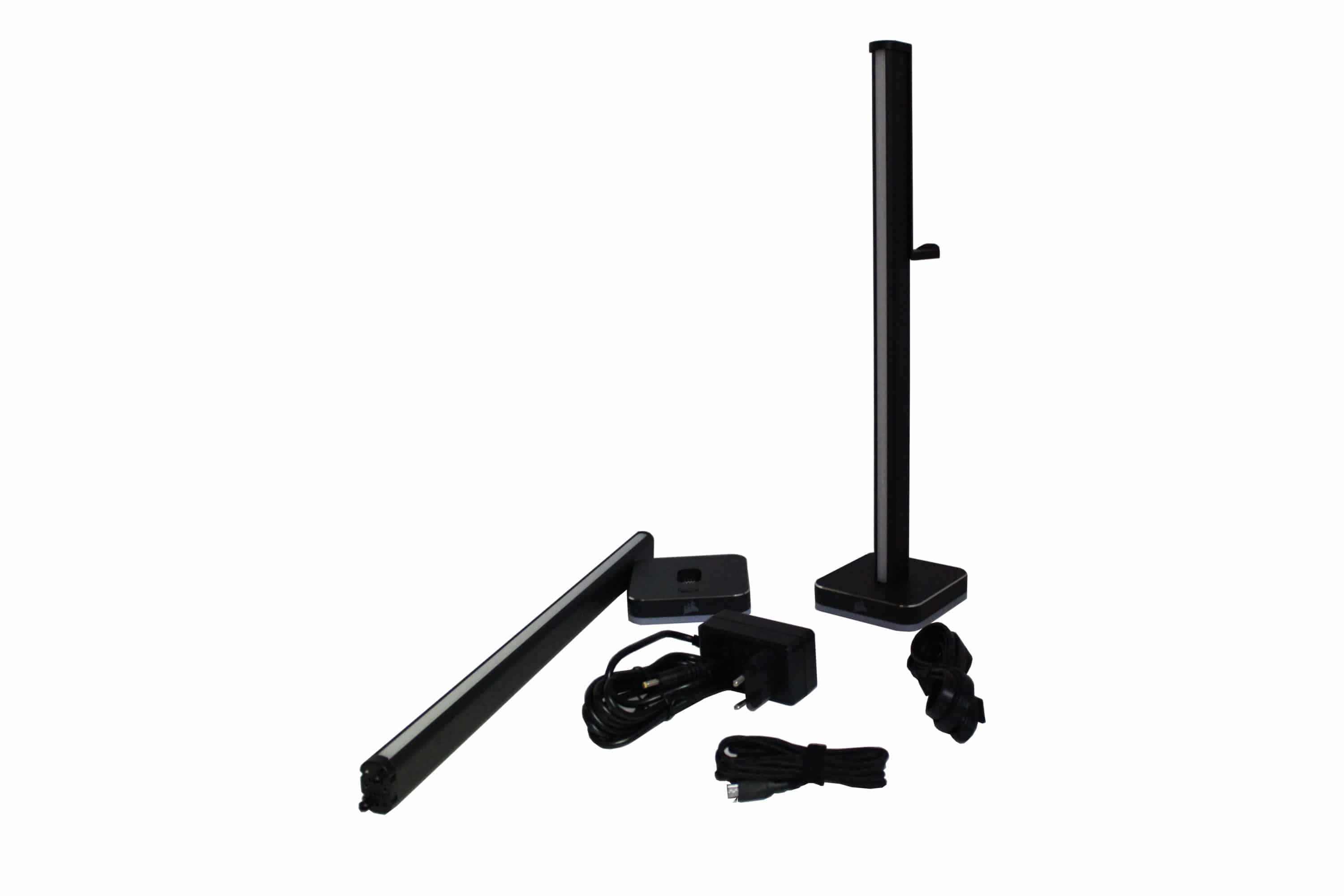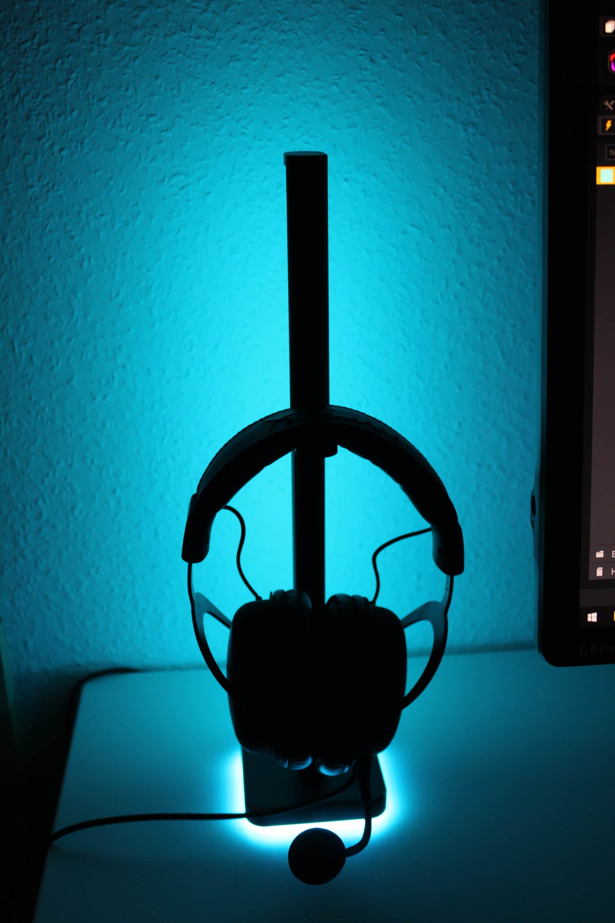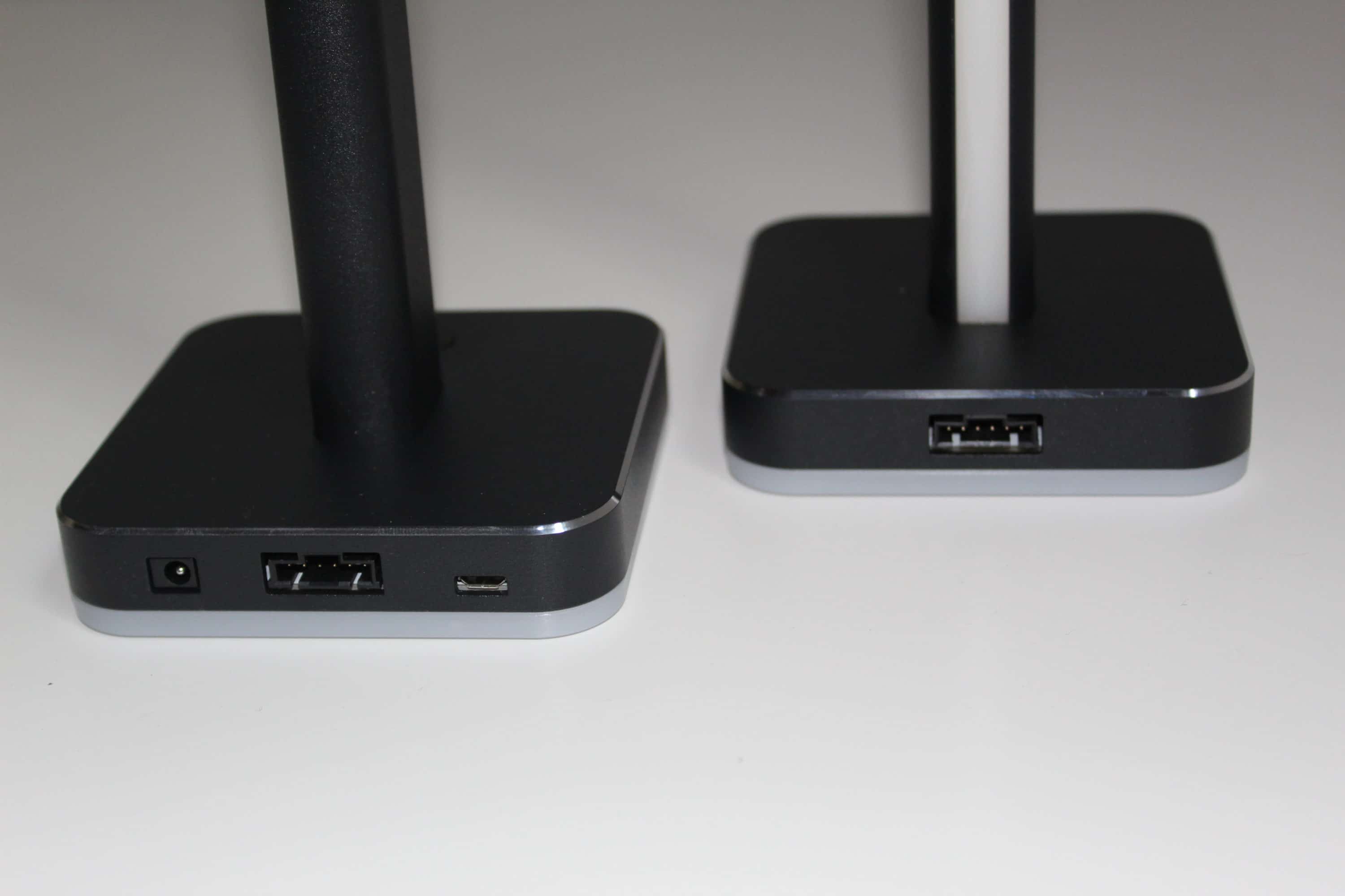 Neben der Säulen und Standfüße sind drei Kabel beigelegt – eins für den Stromanschluss an eine normale Steckdose, eins für die Verbindung zwischen den Säulen und als letztes das USB-Kabel zur Verbindung mit dem Computer. Hier wird auf Mikro-USB gesetzt – schön wäre bereits USB-C als neuer Standard. Dies führt zwar zu keinen Problemen, aber zukunftsorientiert wäre es der sinnvollere Anschluss. Auf der Hauptsäule befindet sich ein einzelner Knopf zur Steuerung der RGB-Funktionen. Falls man den PC nicht für die Steuerung gerade nicht nutzen möchte, kann man die Beleuchtung auch über diesen Knopf ändern. Außerdem erhält man einen Aufsatz, um eine Säule zusätzlich zum Headsetständer umzufunktionieren. Dieser wird von oben auf die Säule gesteckt, zusätzlich kann man ihn mit bereits vormontiertem Klebeband fixieren.