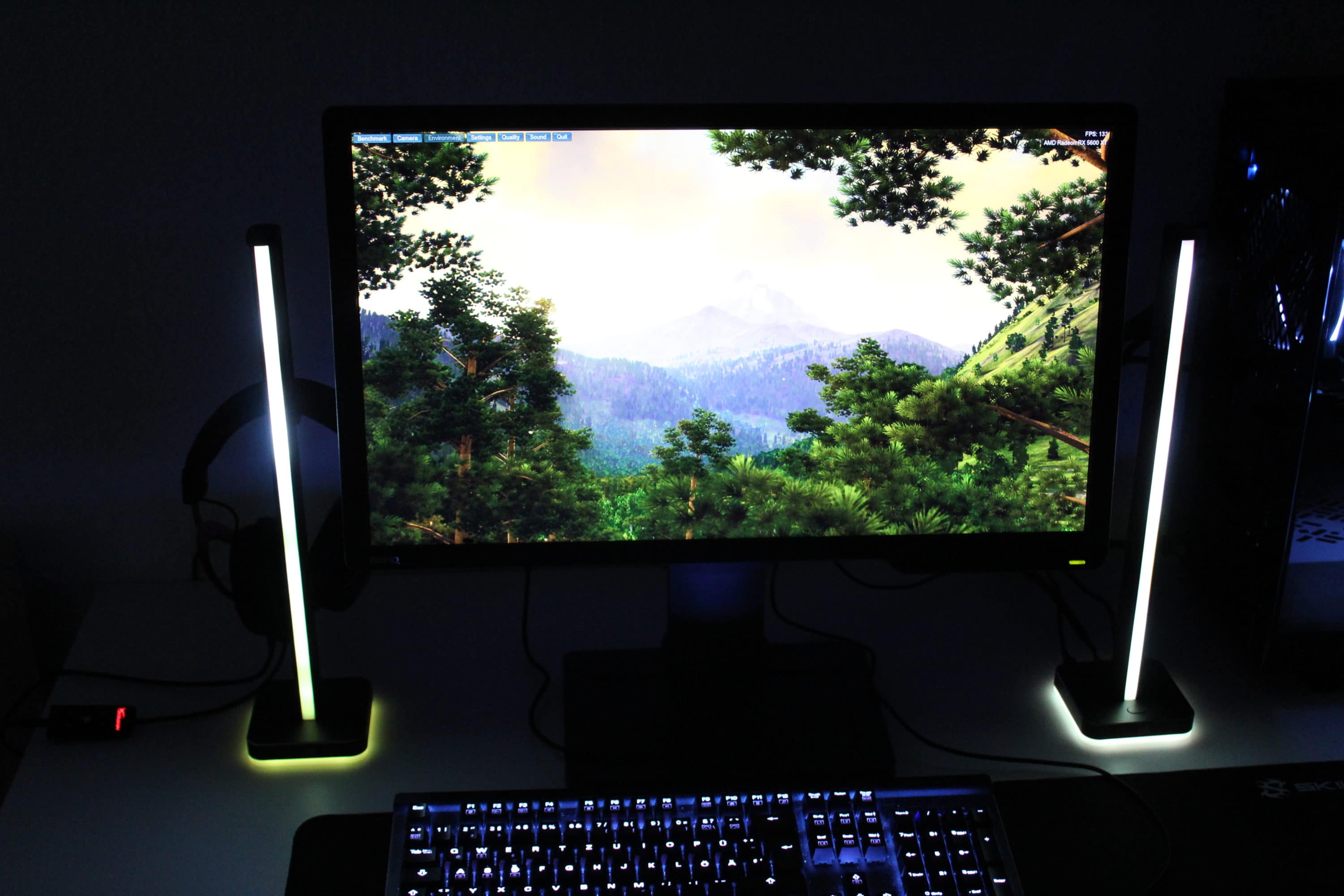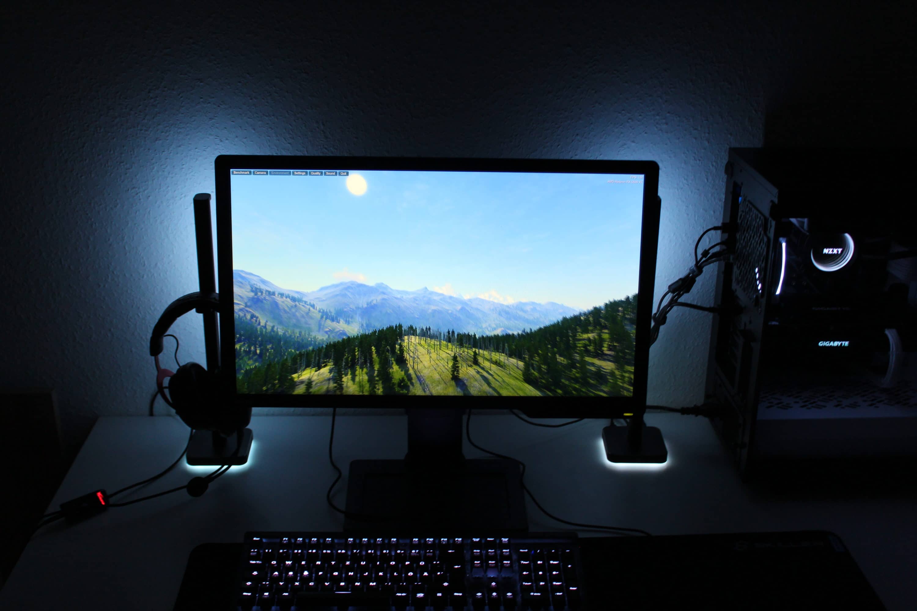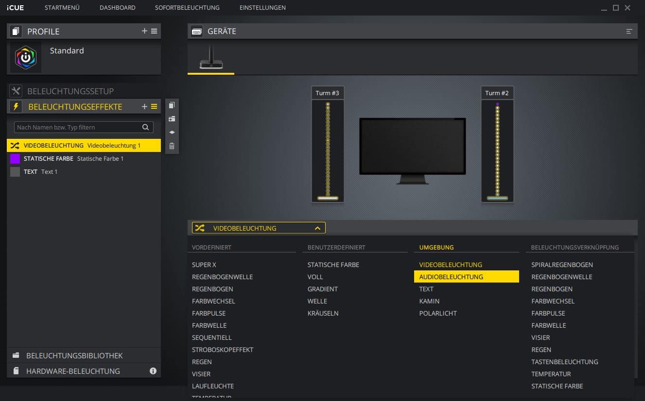 Ein großes Highlight der Umgebung ist die Option „Videobeleuchtung“ – mit dieser ist die Steuerung dynamisch an die Inhalte des Monitors angebunden. Dies sorgt für ein immersives Gefühl, da die Beleuchtung so die Umgebung an das Geschehen des Spiels bzw. Videos anpasst. Im Test war dies die eindrucksvollste und angenehmste Variante.