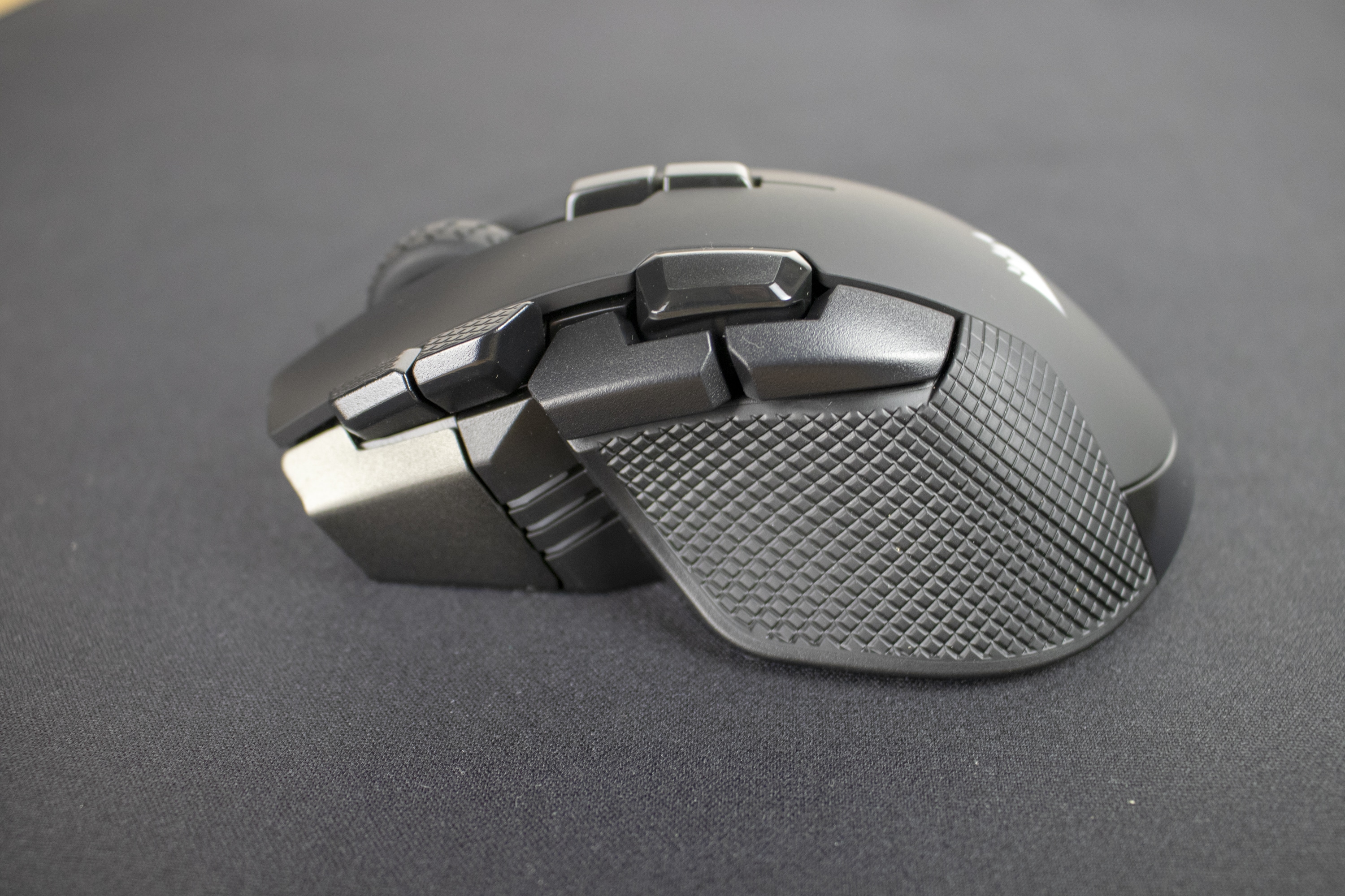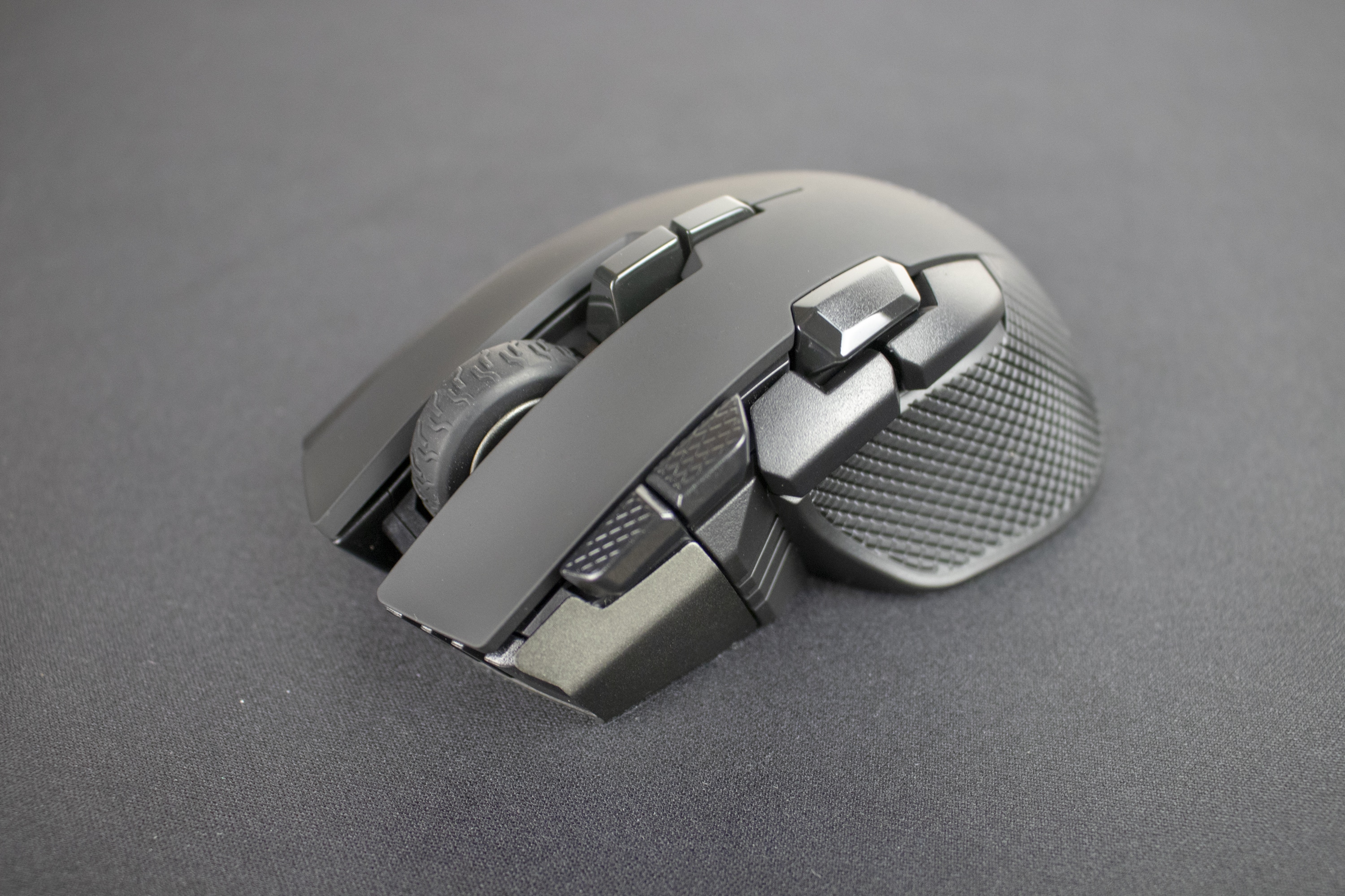 Bereits auf den ersten Blick fällt die Asymmetrie der Maus auf. Sie ist eindeutig für Rechtshänder gemacht. Wer die linke Hand bevorzugt, sollte dringend von einem Kauf dieser Maus absehen, da sie mit links schlicht unbedienbar ist. Auf der linken Seite finden sich nämlich fünf recht große Tasten. Während die beiden vorderen zum Umschalten der DPI-Stufen genutzt werden, dienen die beiden hinteren als Vor- bzw. Zurücktasten. Zwischen diesen vier Tasten ist leicht erhöht die fünfte angebracht, welche als Scharfschützentaste gedacht ist – hält man sie gedrückt, wird ein zuvor festgelegter DPI-Wert aktiviert.