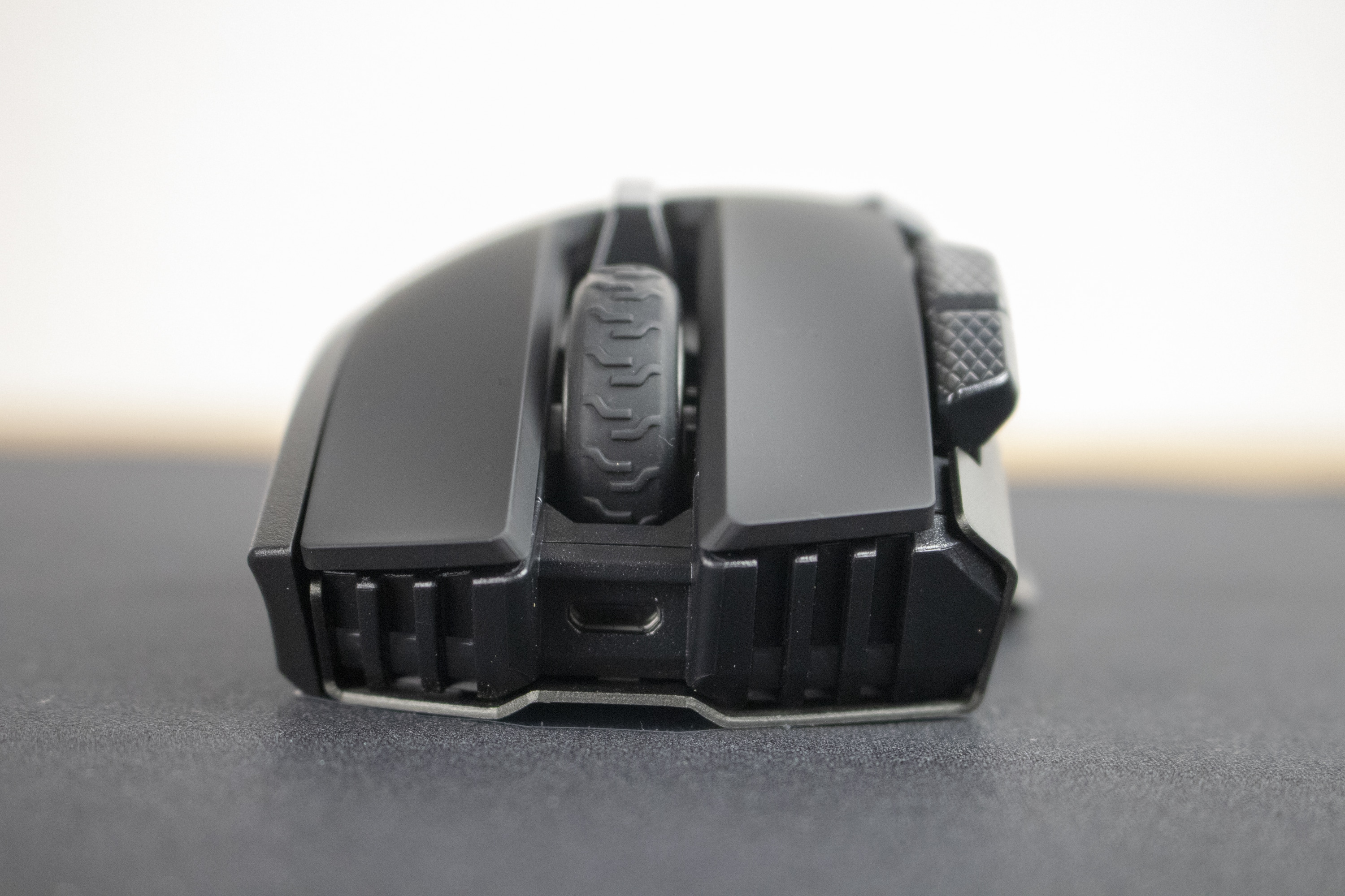 Unter den Tasten sowie auf der rechten Seite der Maus findet sich eine Riffelung, die der Hand Halt gibt. So rutscht die Maus auch im Eifer des Gefechts nicht weg, was positiv zu bewerten ist. Darüber hinaus werden durch die Riffelung auch gestalterische Akzente gesetzt.