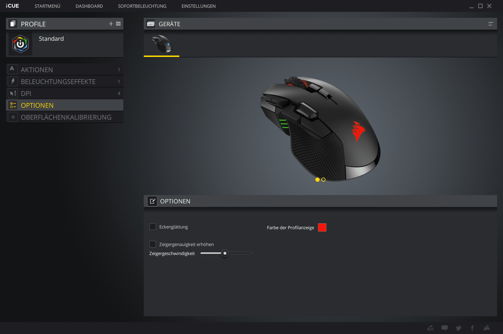 Weiterhin können in der Software drei DPI-Werte zwischen 100 und 18.000 DPI in 1-DPI-Schritten festgelegt werden können. Auf diese Voreinstellungen kann dann per DPI-Schalter an der Maus zurückgegriffen werden. Darüber hinaus lässt sich ein Wert für die Scharfschützentaste festlegen. Der jeweils aktivierte DPI-Wert wird an der Maus durch eine LED-Anzeige kenntlich gemacht. Ist Wert 1 eingestellt, leuchtet eine Leuchte auf. Bei Wert 2 leuchten zwei Leuchten und bei Wert 3 drei Stück.