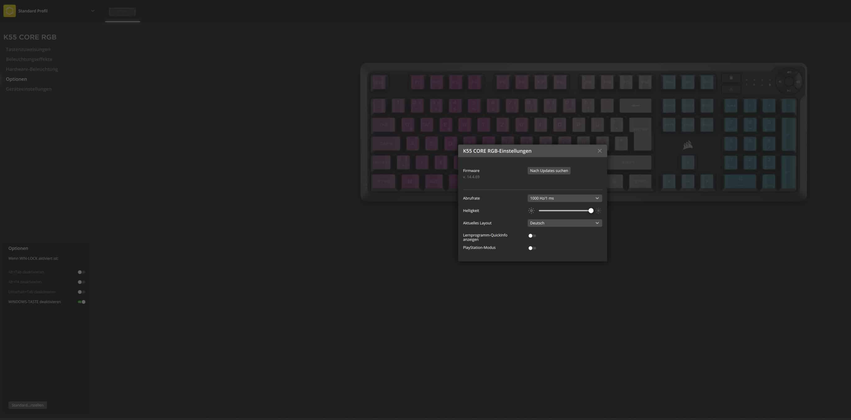 Als Begleit-Software für die Corsair K55 Core kommt, wie immer, Corsair iCUE zum Einsatz, die die Tastatur sofort erkennt und verschiedene Optionen anzeigt. So besteht beispielsweise die Möglichkeit, sämtliche Tasten neu zuzuordnen oder die Beleuchtung in den unterschiedlichsten Effekten anzupassen – auch eigene Beleuchtungsstile sind problemlos möglich.