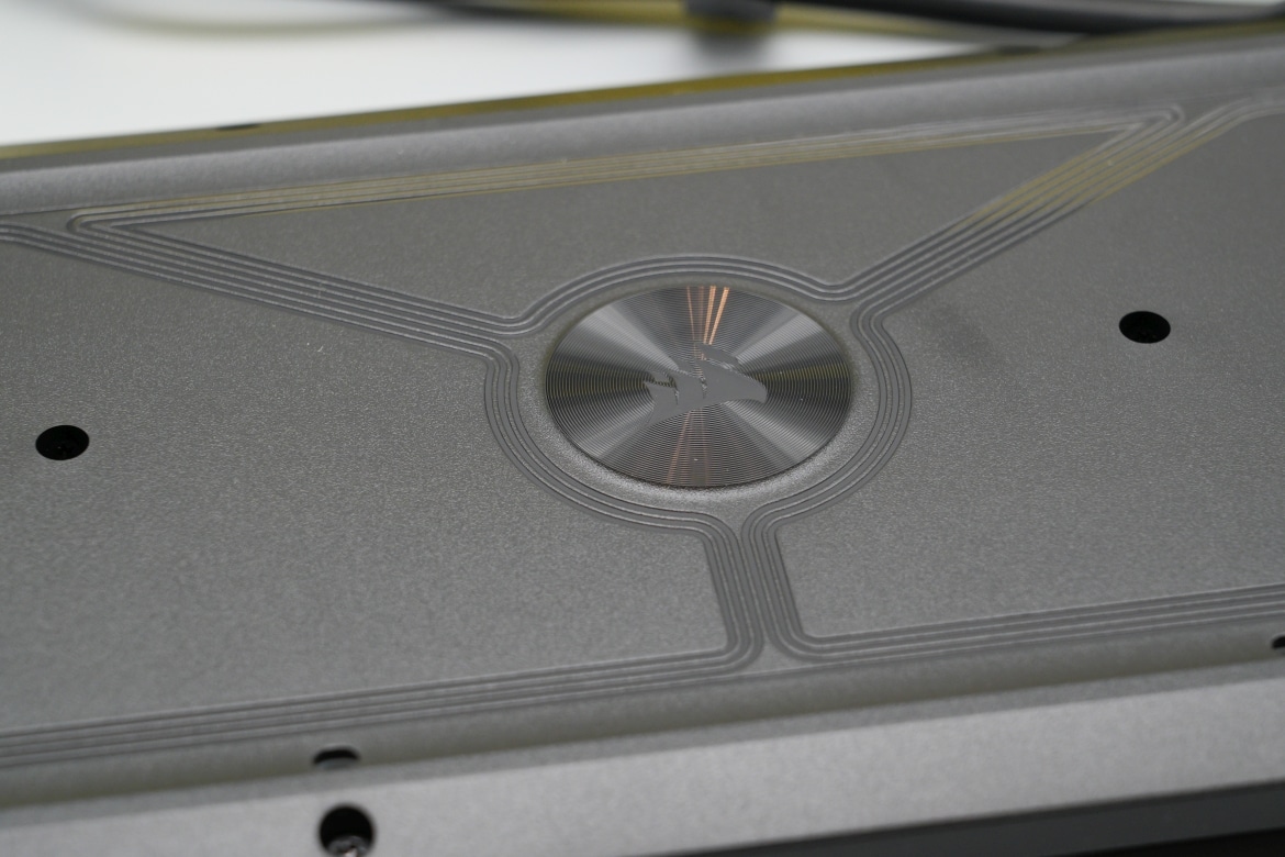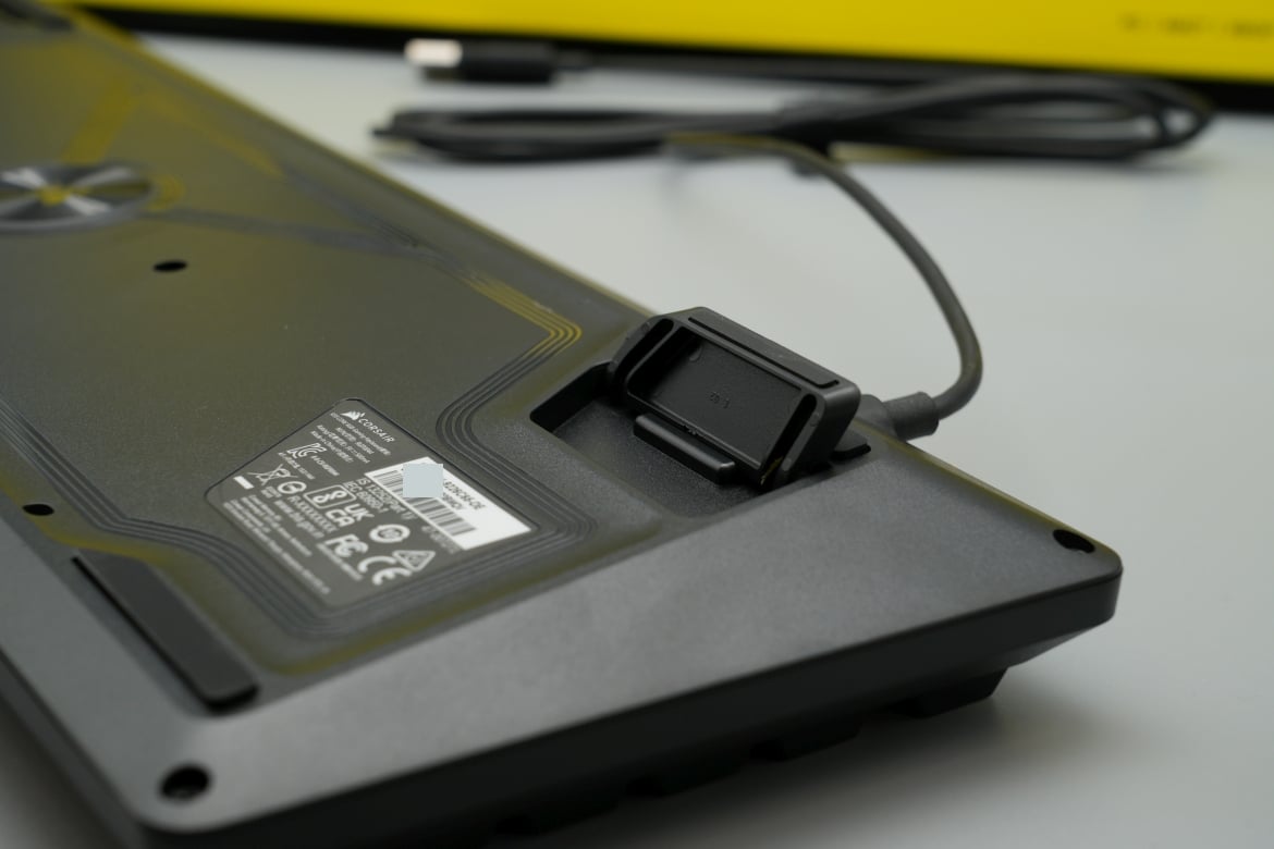 Dennoch wirkt der Rahmen vergleichsweise hoch, was zunächst einmal für ein ungewohntes Tippgefühl sorgt. An der Unterseite sticht sofort das glänzend abgesetzte, geriffelte Corsair-Logo in der Mitte ins Auge. Hier finden wir zudem zwei Standfüße, mit denen sich der Winkel beim Aufstellen anpassen lässt. Vier Gummifüße sorgen zudem für einen sicheren Stand.