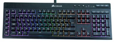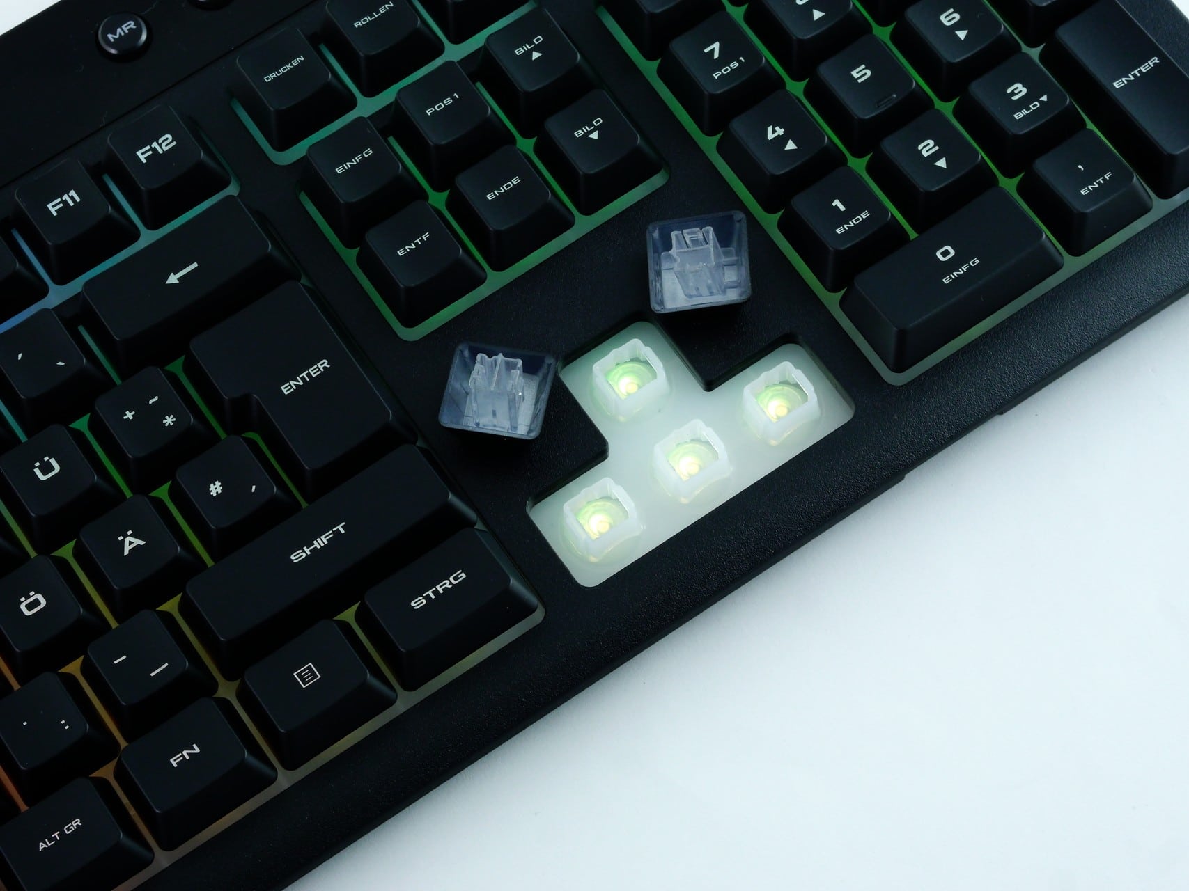 Auch diese setzen auf Rubberdome-Switches und sind ebenso durch RGB-LEDs beleuchtet. Anstatt der bei Rubberdomes oft eingesetzten, günstigeren Hintergrundbeleuchtung, setzt Corsair dabei auf den Beleuchtungsansatz von mechanischen Tastaturen: Jede Taste der K57 RGB Wireless verfügt über eine eigene LED. Dadurch entsteht ein sehr gleichmäßiges Lichtbild, lediglich unter der Leertaste ist eine Verdunkelung zu erkennen.