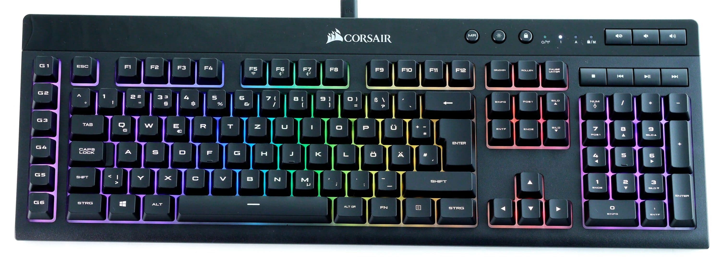 Wie eingangs erwähnt, ist die K57 RGB Wireless eine der wenigen Tastaturen von Corsair, die nicht auf mechanische Taster setzt, sondern auf Rubberdomes. Diese sollen laut Corsair ein taktiles Druckverhalten aufweisen und 20 Millionen Betätigungen überstehen.