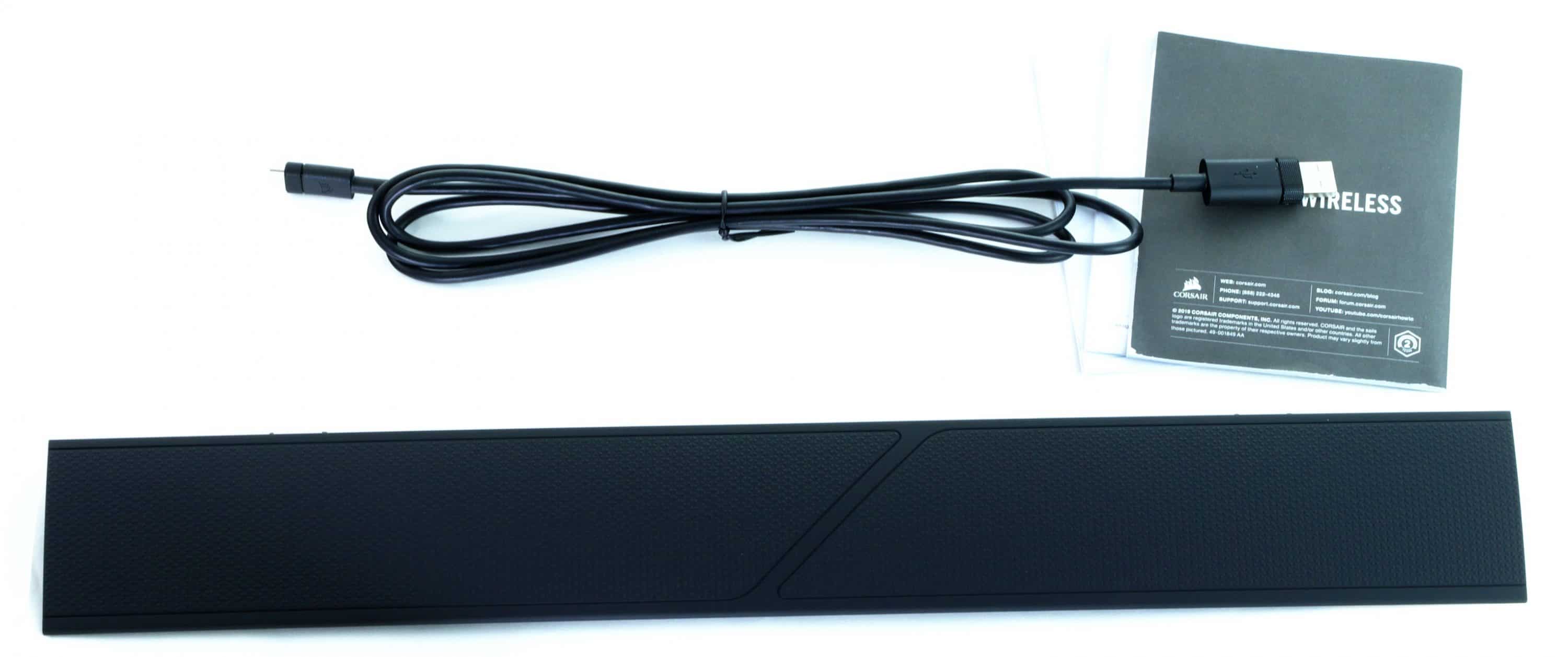 Die K57 RGB Wireless wird in einem Pappkarton in dem für Corsair typischen Design geliefert. Das Zubehör besteht aus einer Anleitung und Garantiehinweisen, einem USB-Kabel ohne Ummantelung und einer optionalen Handballenauflage mit einer Tiefe von 6,5 cm.