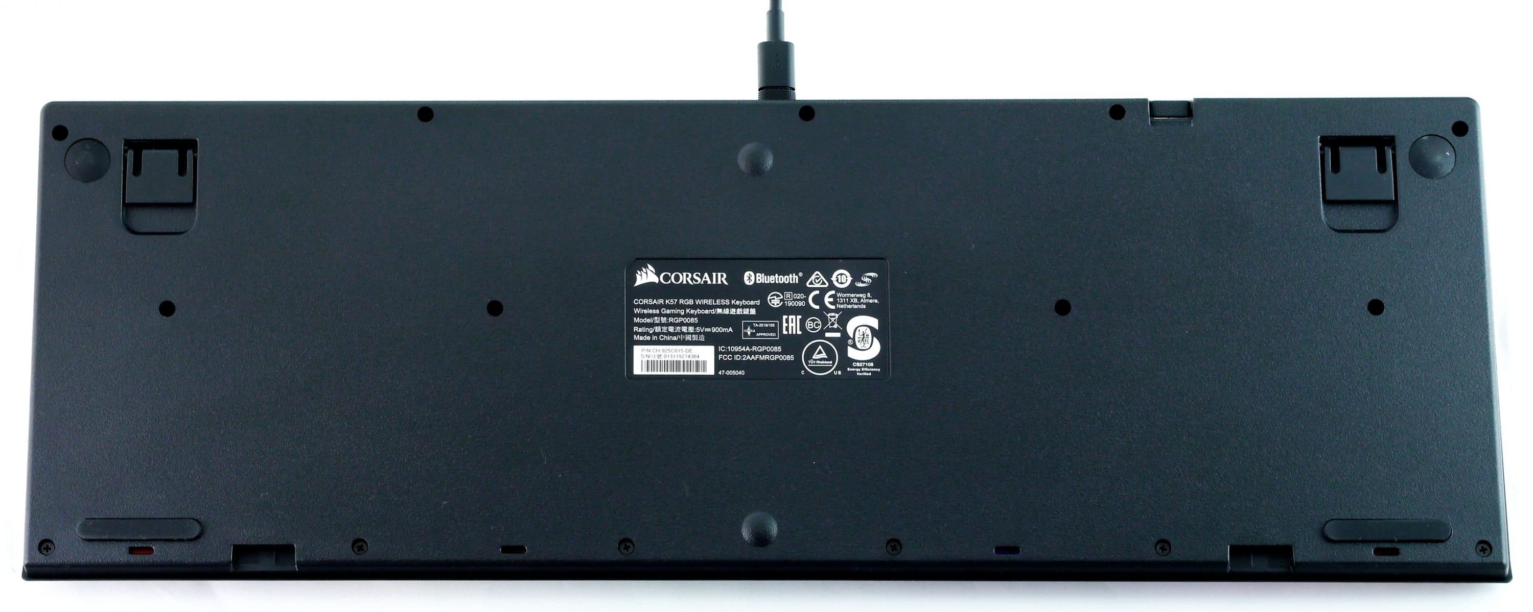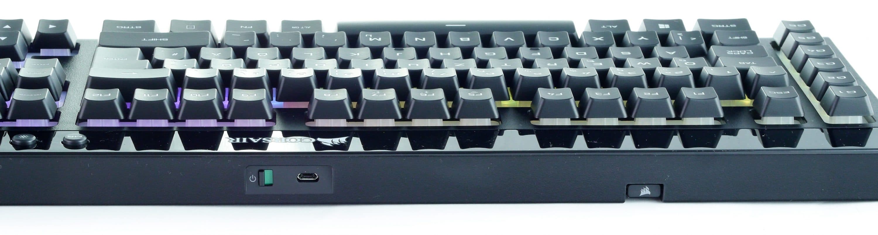 Während der Großteil der Tastatur aus mattschwarzem Kunststoff besteht, setzt das Gehäuse oberhalb der F-Reihe auf eine glänzend schwarze Oberfläche. Auf dieser befinden sich das Herstellerlogo, die Funktions- und drei der Multimediatasten sowie die Status-LEDs. Abseits davon ist die K57 RGB Wireless größtenteils unspektakulär: Einstufige Klappfüße, ein schlichtes Kunststoffgehäuse und ein Micro-USB-Anschluss an der Rückseite. Zudem sind dort auch eine Halterung für den mitgelieferten Sender und ein Schalter verbaut, mit dem die Tastatur eingeschaltet werden kann.