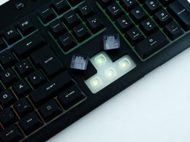 Positiv sind wiederum die von Corsair verbauten Rubberdomes. Die Umsetzung ist natürlich nicht mit dem sehr definierten Schreibgefühl der meisten mechanischen Tastaturen zu vergleichen, doch sind die verbauten Taster durchaus angenehm – hier hat sich das Unternehmen Mühe gegeben. Hardcore-Fans von mechanischen Tastaturen werden hier wohl nicht glücklich, aber prinzipiell ist eine Umgewöhnung sehr schnell möglich und im Schreibgefühl steht die K57 RGB Wireless einer mechanischen Tastaturen nicht nennenswert nach.