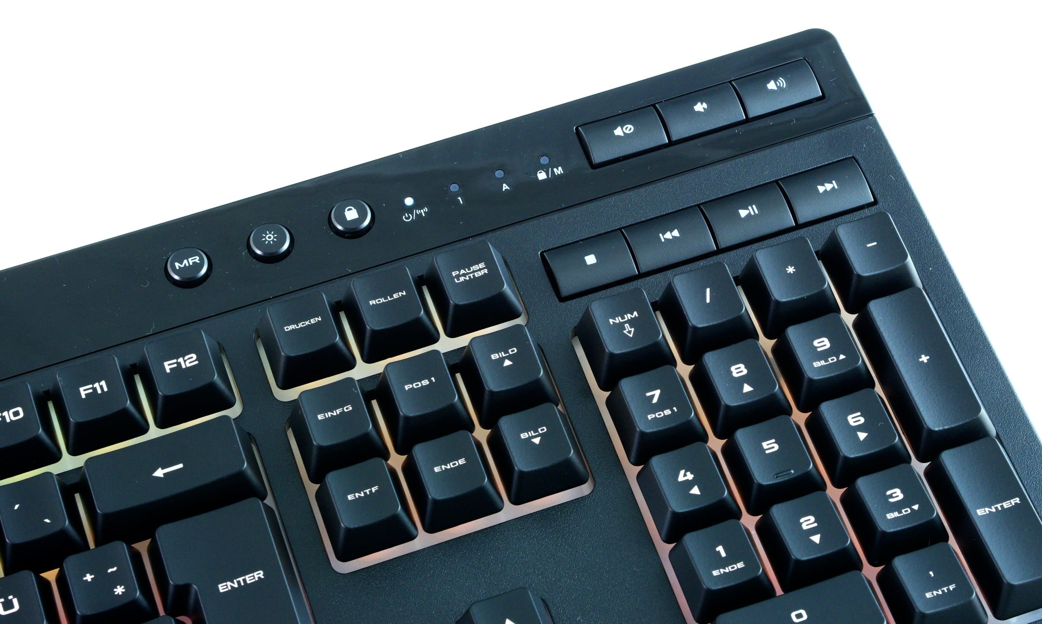 Im Gegensatz zur Konkurrenz aus eigenem Hause, der Corsair K63 Wireless mit mechanischen Tasten, verfügt die K57 RGB Wireless über einen Nummernblock. Zudem gibt es neben den bekannten Multimedia- und drei Funktionstasten noch eine zusätzliche Reihe Makrotasten, die an der linken Seite untergebracht ist.