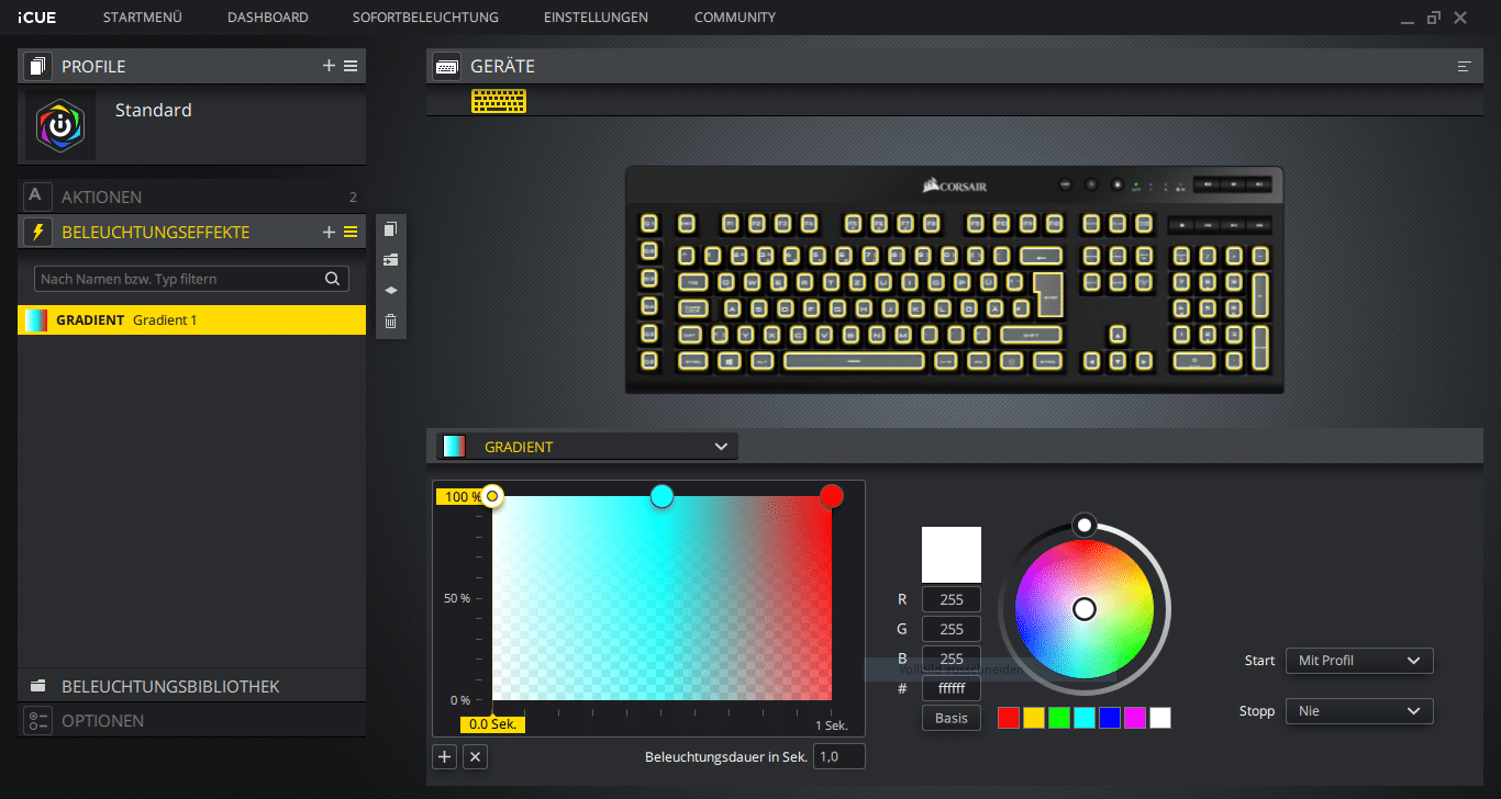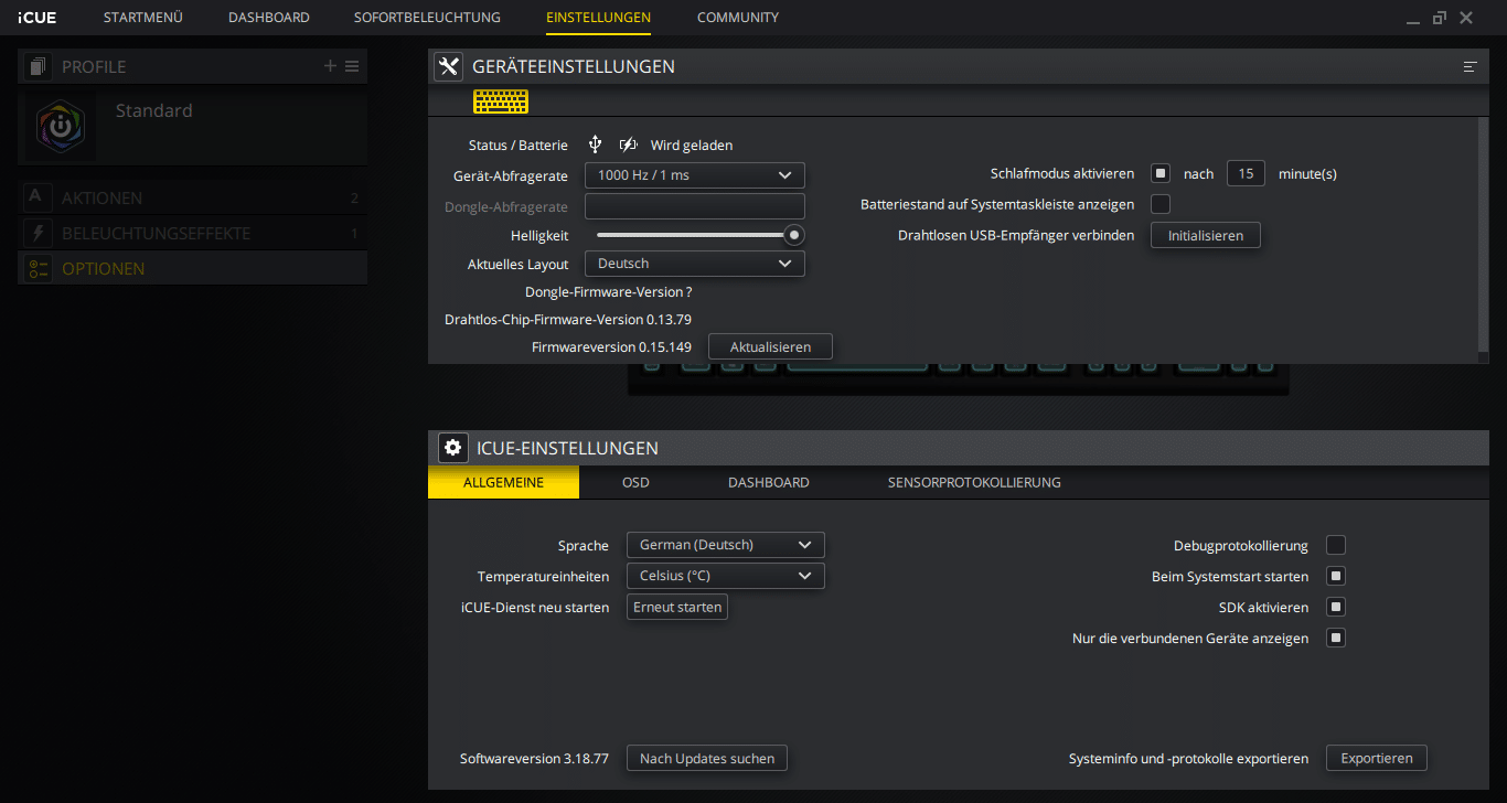 Als Steuerungsprogramm kommt die von Corsair gewohnte iCUE-Software zum Einsatz. Dabei ist die Ansteuerung der Tastatur allerdings nicht ganz so einfach wie gewohnt, denn es gibt einige Besonderheiten. Nur wenn die Tastatur per Kabel angeschlossen ist, bietet sie den vollen Funktionsumfang.