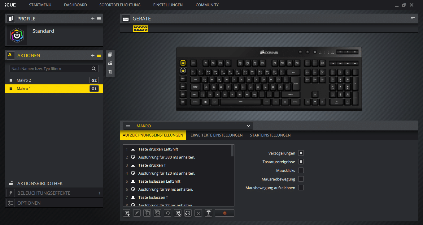 Im kabellosen Modus stehen zwar immer noch viele Beleuchtungseffekte zur Auswahl, doch fehlen dann die Optionen zur Erstellung eigener Effekte sowie die Synchronisation mit anderen RGB-Produkten. Außerdem hat Corsair der Tastatur offenbar nur einen geringen Speicher beschert, denn dieser kann sich nur die sechs Makrotasten (bis 50 Zeichen) in Kombination mit dem am Gerät eingestellten Beleuchtungseffekt merken. Stellt man hingegen in der Software etwas ein, so funktioniert das nur, wenn diese im Hintergrund läuft.