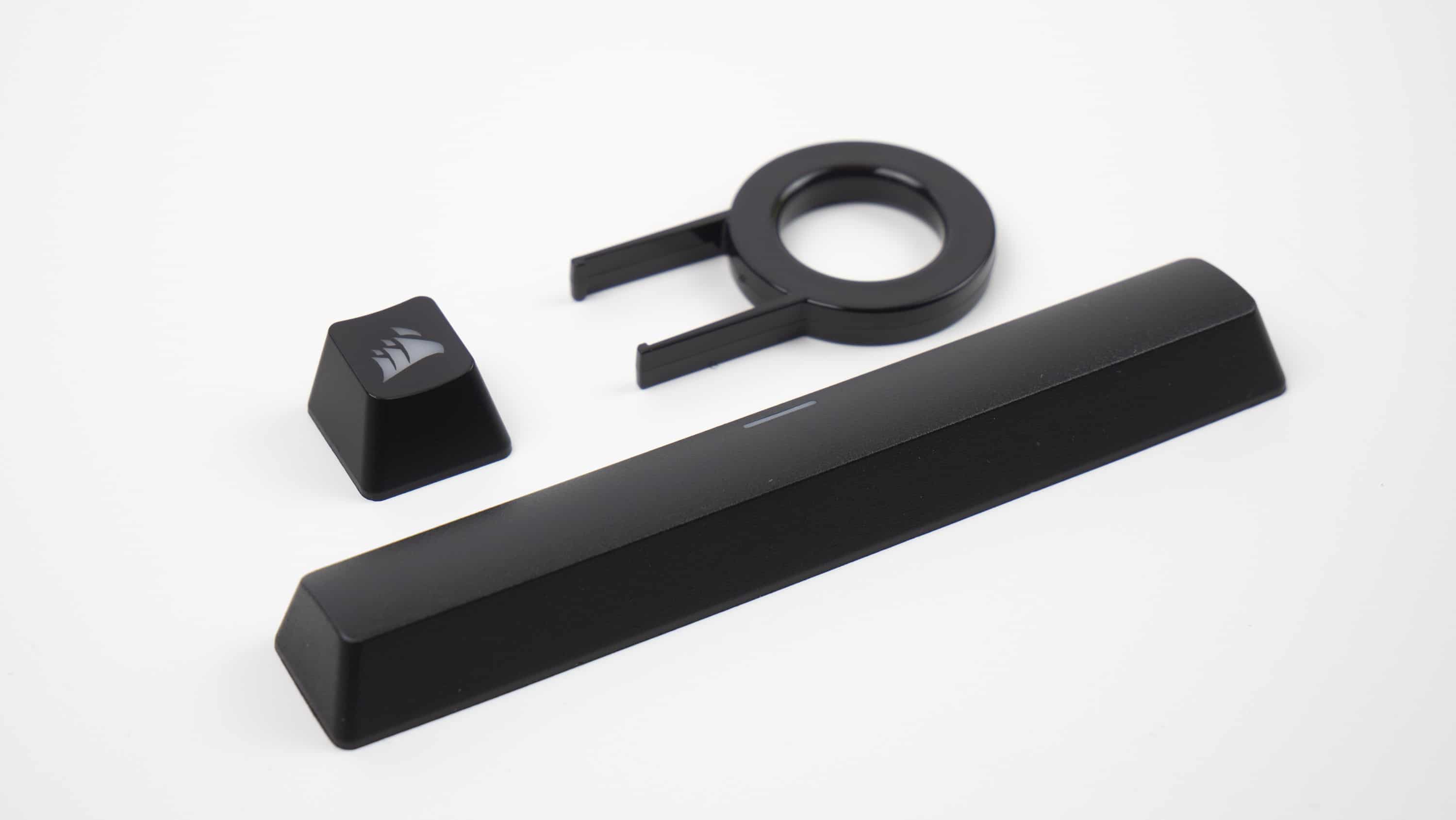 Innerhalb der Verpackung erwarten uns neben der kompakten Tastatur eine zweite Leertasten-Kappe aus ABS, die auf der Abbildung zu sehen ist, eine weitere Kappe mit Corsair-Logo darauf, für die ESC-Taste, das USB-Anschlusskabel sowie ein Tastenabzieher.