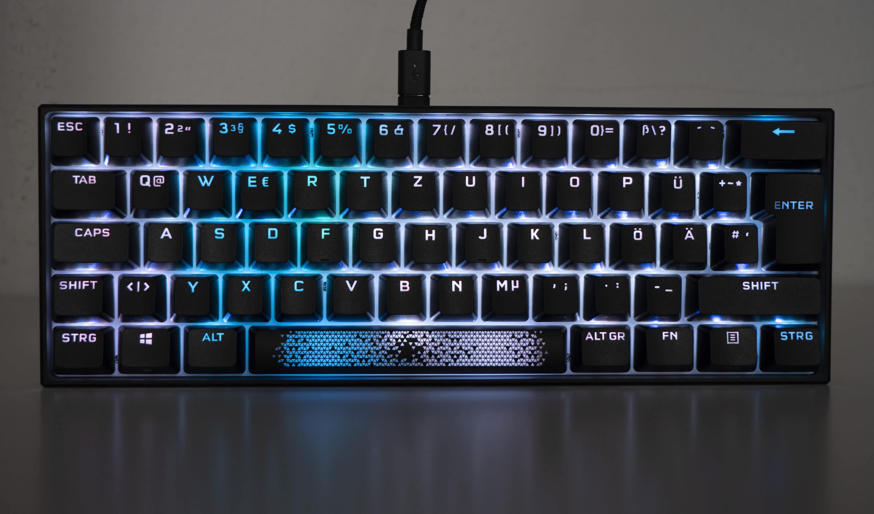 Von außen gesehen macht die Corsair K65 RGB Mini ordentlich etwas her und ist trotz der Größe ein Eyecatcher auf jedem Schreibtisch und jedem noch so leuchtenden Gaming-Setup. Besonders gut hat uns die Optik mit der beiliegenden Kappe für die Leertaste gefallen, welche mit einem aus vielen kleinen Dreiecken bestehenden Muster versehen ist.
