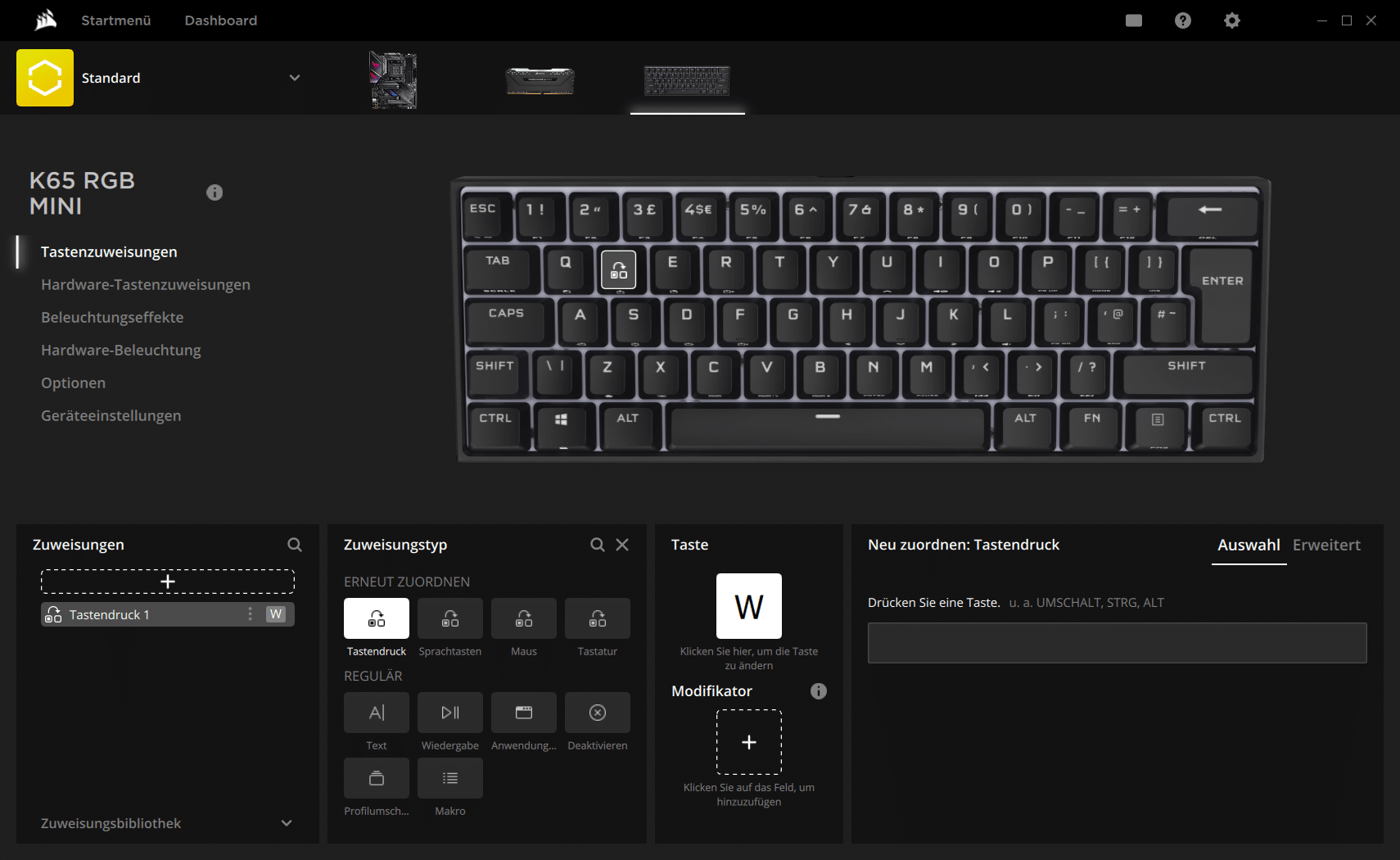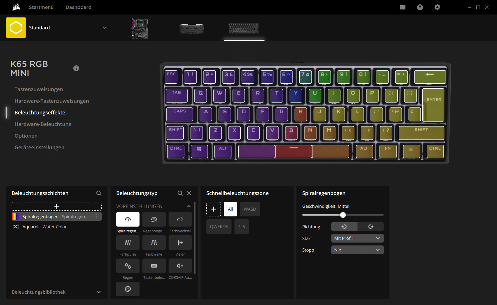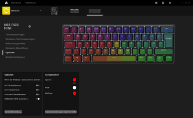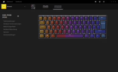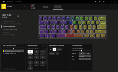 Wer es selbst und detaillierter machen möchte, dem bietet die Corsair-Software iCUE jede Menge Möglichkeiten. Zusammen mit der neuen K65 RGB Mini präsentiert Corsair auch iCUE 4. Genauso wie bei der vorherigen Version können sämtliche Farben auf die Taste genau eingestellt werden, Effekte gewählt und weitere Einstellungen vorgenommen werden.