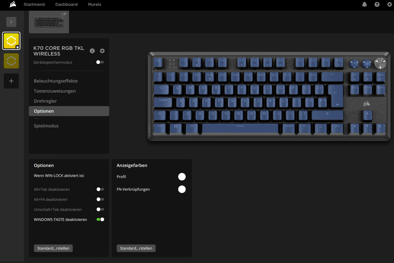 Für die Gaming-Session mit der Corsair K70 Core TKL Wireless RGB können wir auch einen Gaming-Modus anschalten. Ihr könnt entscheiden, welche Funktionen abgeschaltet werden. Nutzt ihr die Tastatur trotz der kabellosen Funktion mit einem Kabel können auch unterschiedliche Abfrageraten verwendet werden.