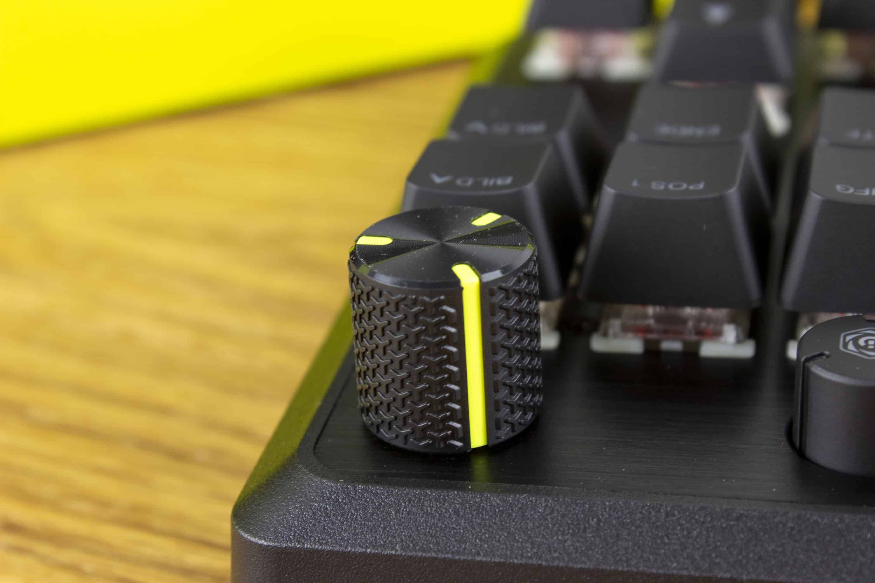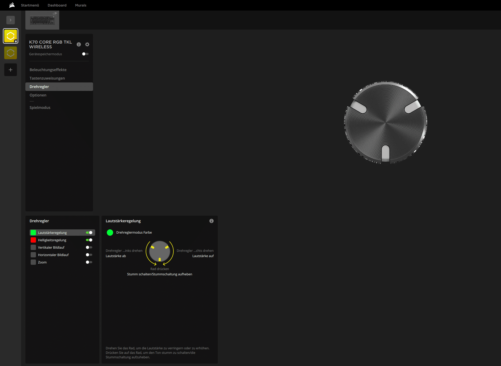Über die FN-Taste und F12 können verschiedene Funktionen für den Drehschalter durchgeschaltet werden. Die entsprechenden Funktionen werden durch die RGB-Beleuchtung gekennzeichnet. Standardmäßig ist die Lautstärkeregelung aktiv. Über das Durchschalten können wir aber auch die Helligkeit der Beleuchtung regeln oder den Drehschalter zum Scrollen nutzen. Das Ein- und Ausschalten der einzelnen Funktionen erledigen wir über die iCUE-Software.