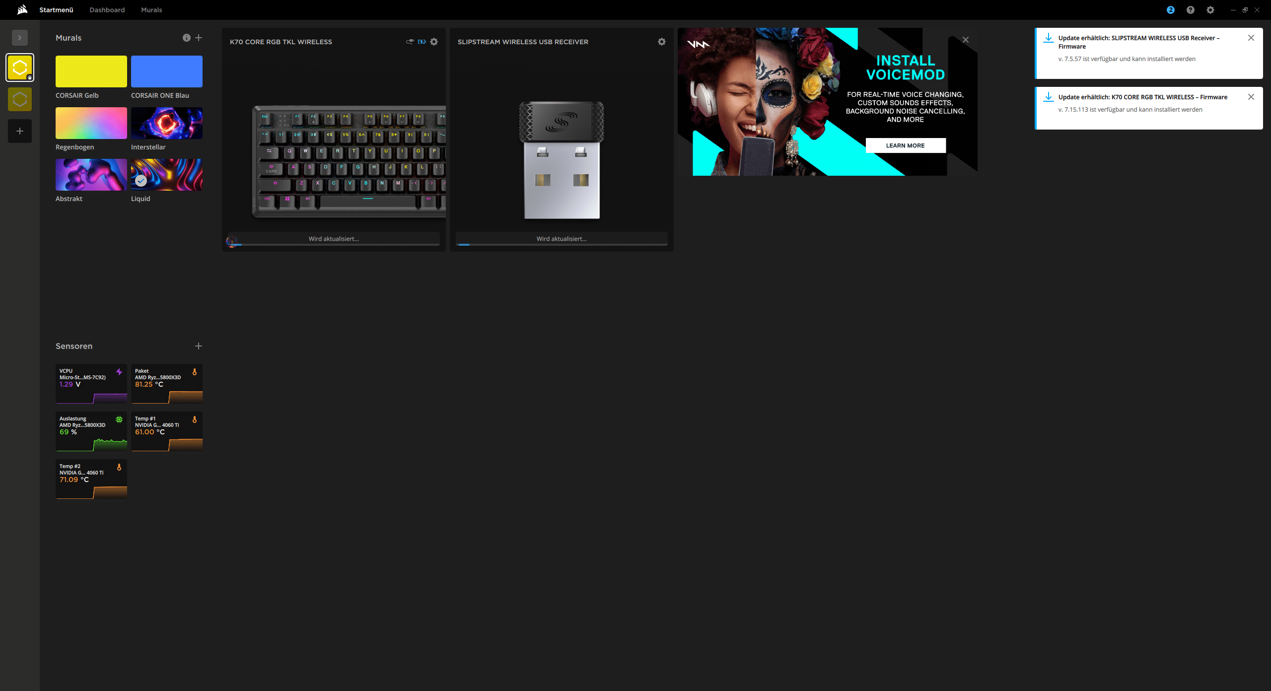 Bei allen aktuellen Corsair-Produkten kommt die Software iCUE zum Einsatz. Hier lassen sich natürlich eigene Einstellungen vornehmen, wie zum Beispiel die Individualisierung der Beleuchtung. Ein wichtiger Bestandteil ist heutzutage aber auch das Durchführen von Updates. Stehen Updates zur Verfügung werdet ihr direkt nach dem Öffnen auf diese aufmerksam gemacht. Mit einem Klick können diese ausgeführt werden.