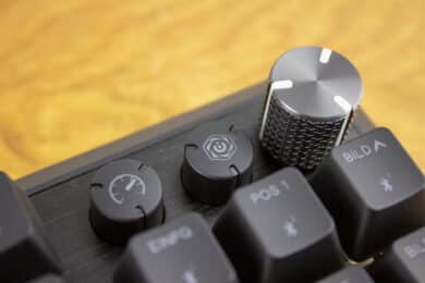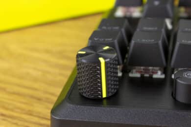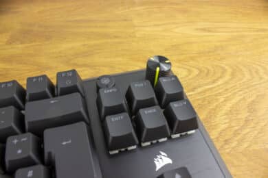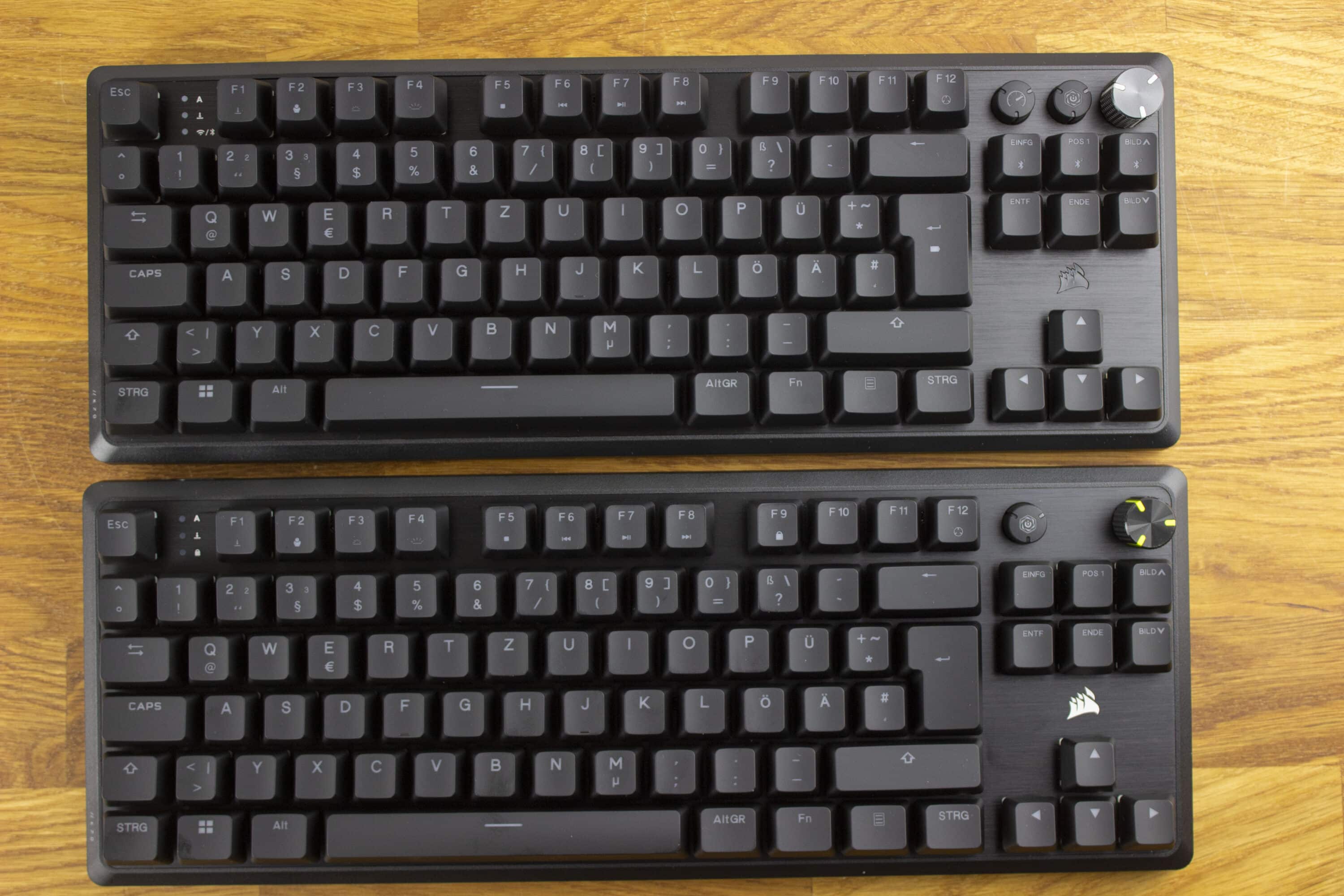 Bei beiden Tastaturen befindet sich oben rechts ein Drehregler, der in der Standardeinstellung zur Lautstärkeneinstellung verwendet. Farblich setzt sich lediglich das kabelgebundene Modell etwas ab. Dort sind die Akzente in gelb. Ansonsten gegenüber der K70 Core TKL Wireless lediglich ein Knopf für das von Corsair genannten Game-Modus.