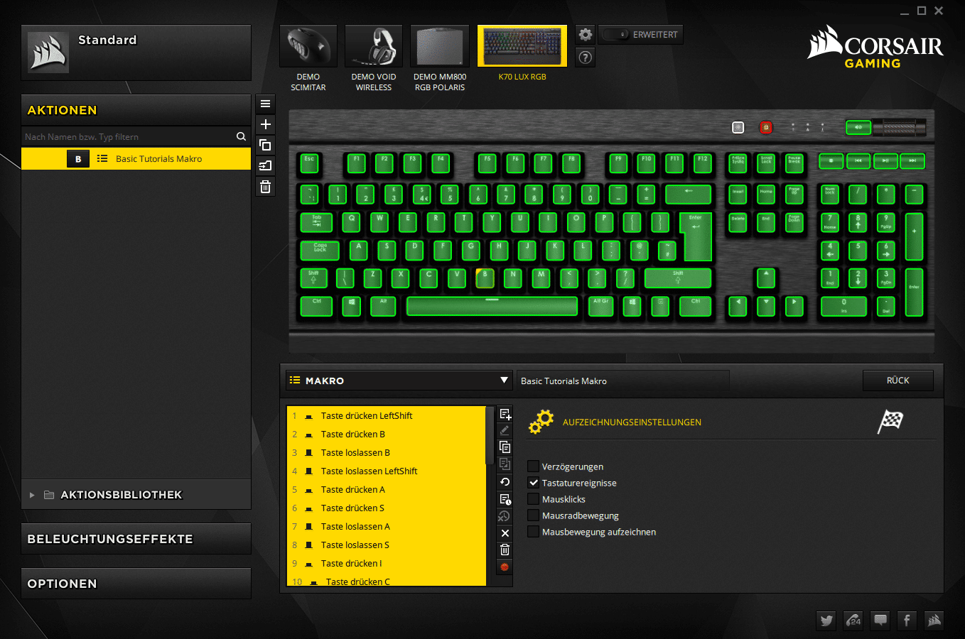 Nicht fehlen dürfen an dieser Stelle natürlich die Makros für Gamer. So lässt sich jede Taste beliebig mit einem Makro versehen, das nicht nur Tastaturanschläge, sondern auch Mausbewegungen und -klicks beinhaltet.