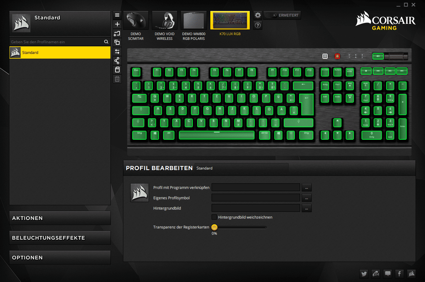 Nachdem die recht ansehnliche Verpackung der Tastatur geöffnet wurde, dürfte auffallen, dass keine Software für die Steuerung der RGB-Beleuchtung enthalten ist. Es findet sich jedoch ein Hinweis auf die Homepage des Anbieters, von der diese Software geladen werden kann. Die Installation ist selbsterklärend und sollte auch von Laien problemlos durchgeführt werden können. Anschließend lassen sich unzählige Farbeffekte einstellen. Jede Taste kann mit einer eigenen Hintergrundbeleuchtung belegt werden. Die verschiedenen Beleuchtungsprofile lassen sich abspeichern und im Anschluss immer wieder aktivieren. Wer über weitere Corsair-Produkte verfügt, kann die Beleuchtung der einzelnen Geräte zudem aufeinander abstimmen, was die Wirkung der Lichteffekte weiter verstärken dürfte. Profile können einfach ex- und importieren