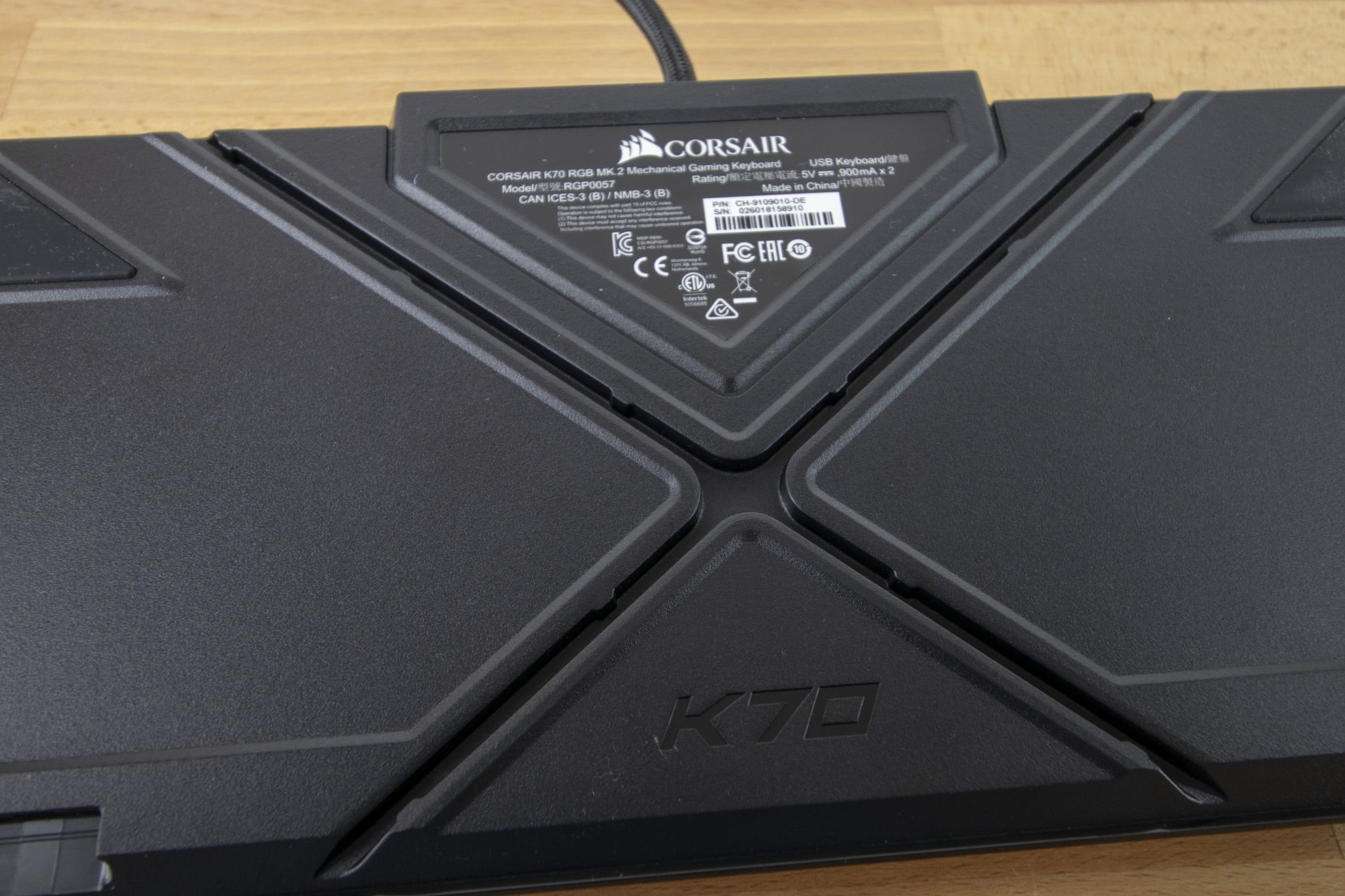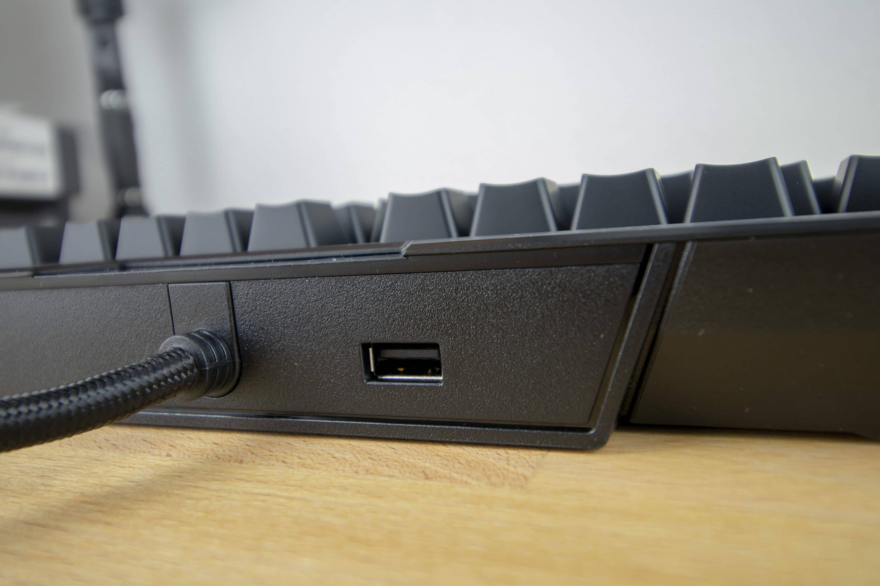 Als besonderes Extra bietet die Corsair K70 RGB MK.2 außerdem noch einen USB-Passtrough-Anschluss. Somit habt ihr einen zusätzlichen USB-Anschluss direkt an der Tastatur. Zusätzlich befinden sich diverse Kabelkanäle als Neuerung an der Unterseite der Gaming-Tastatur.