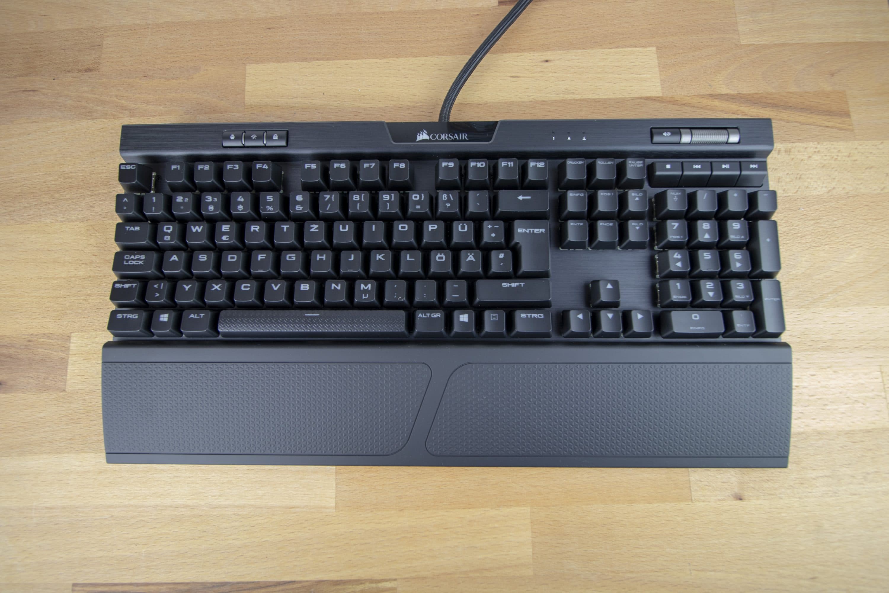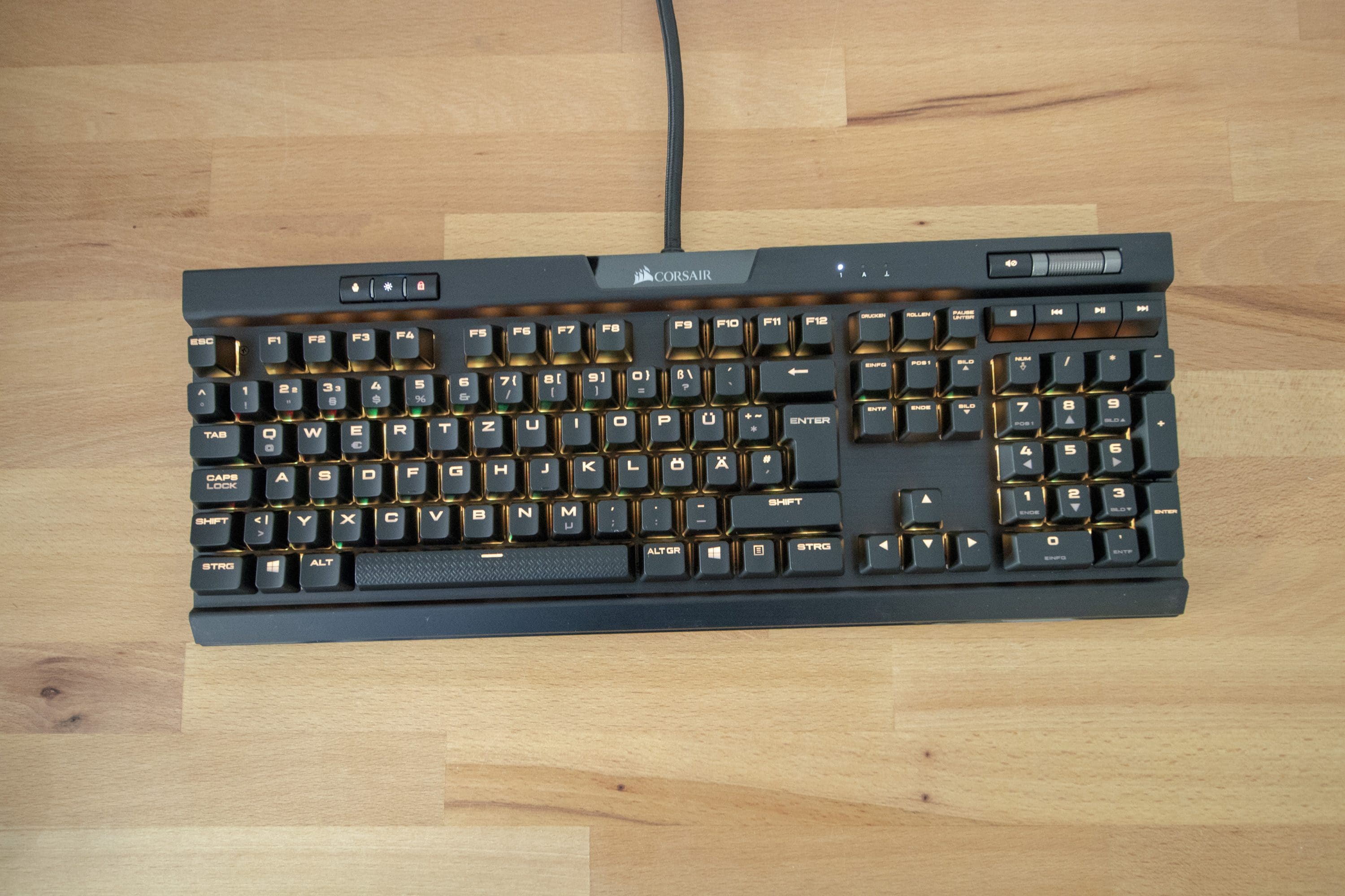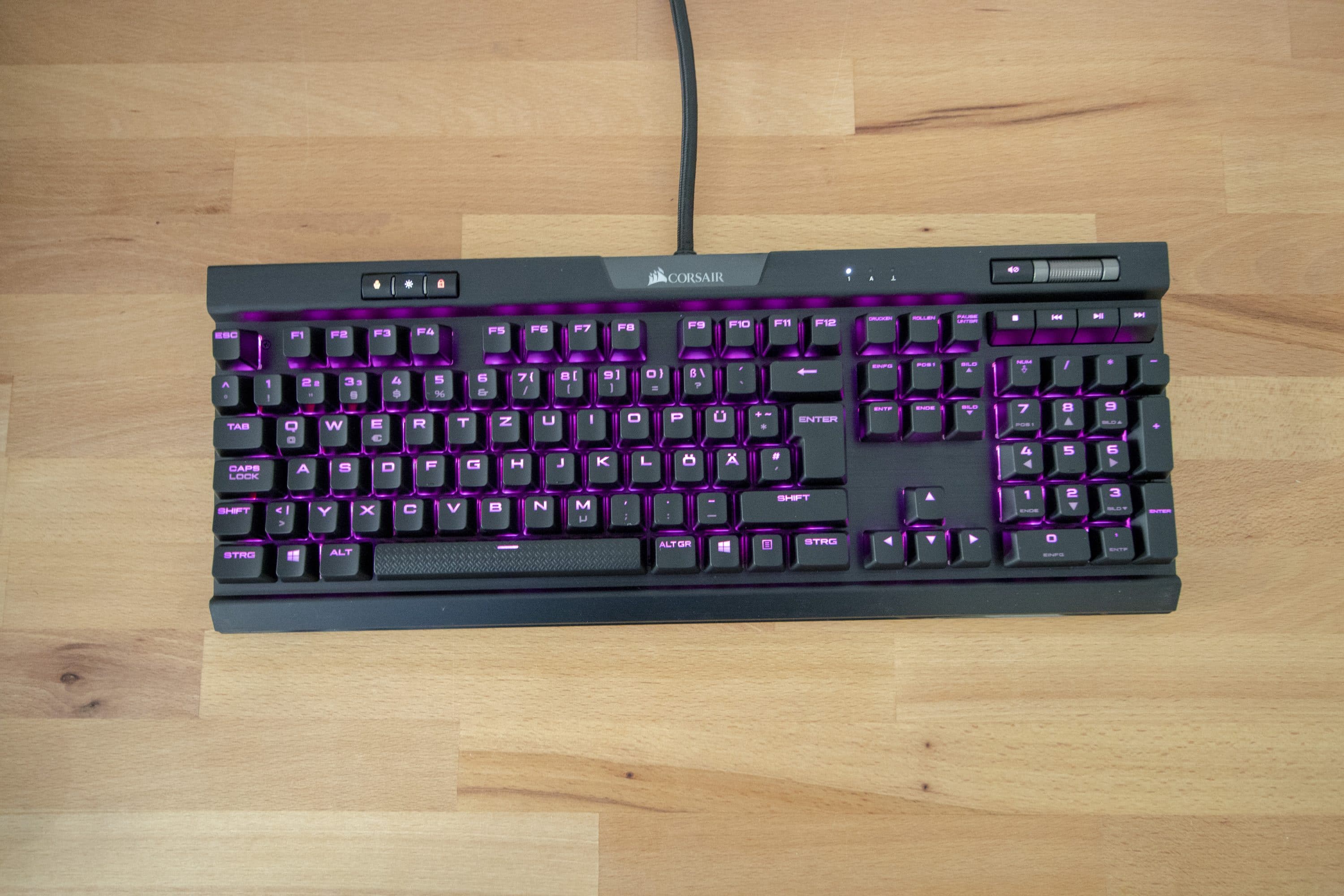 Die Tasten schweben über der Aluminiumplatte. Zahlreiche Gaming-Tastaturen setzen auf diese freien, nicht im Gehäuse versenkten Tasten, sodass dieser optische Aspekt Gaming-Freunde nicht allzu sehr überraschen sollte. Die Tasten lassen sich individuell beleuchten, praktisch jede Farbe ist einstellbar. Auffällig sind weiterhin das Corsair-Logo und der Lautstärkeregler, die leicht erhöht sitzen. Das Logo ist darüber hinaus beleuchtet.