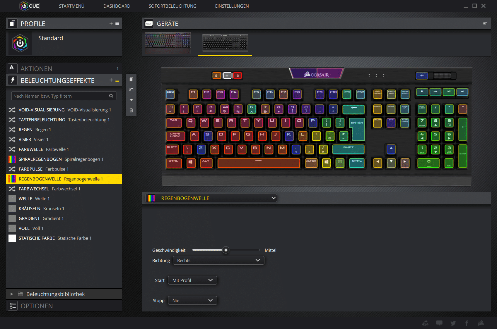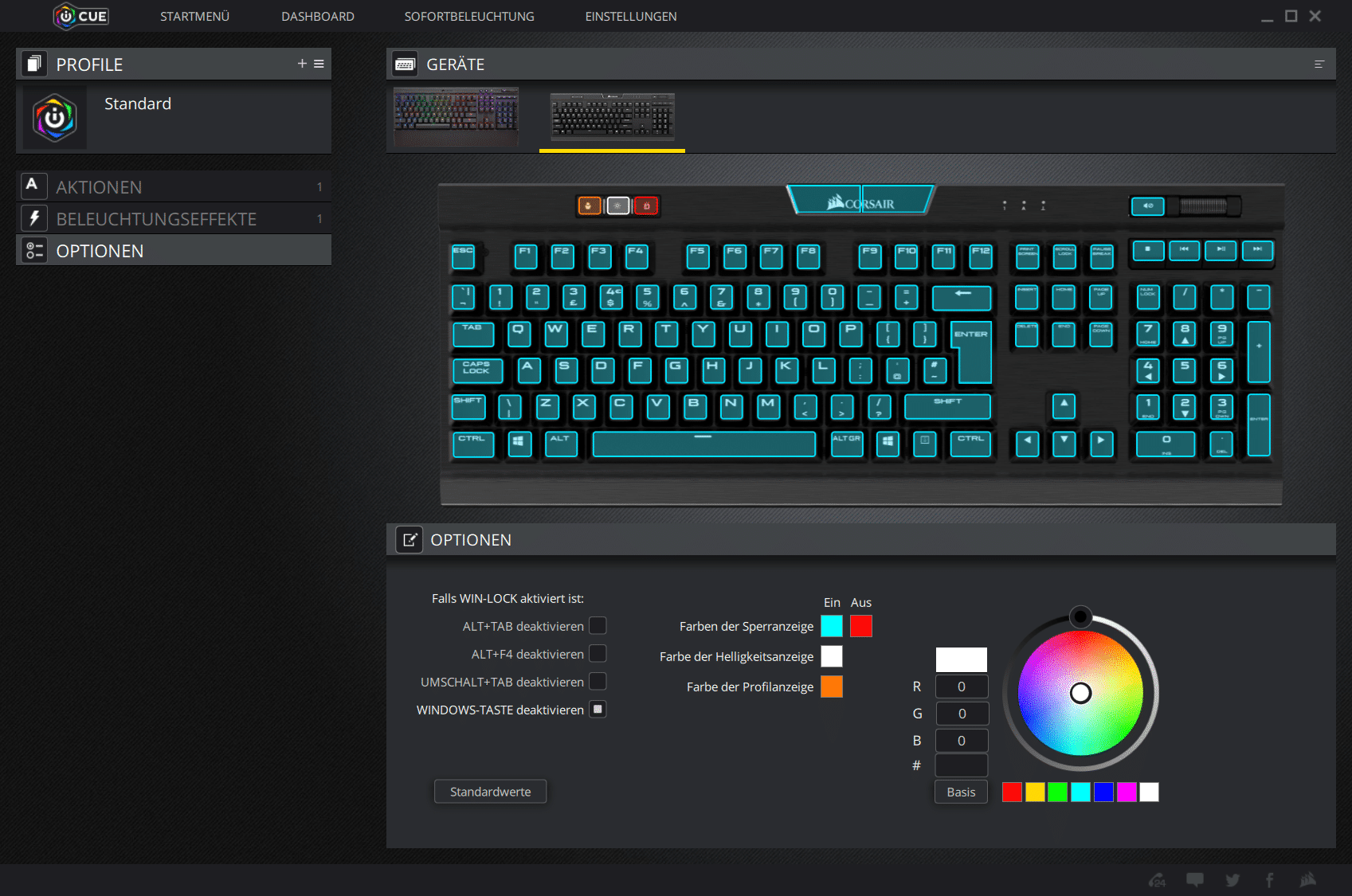 Wie eingangs bereits kurz erwähnt wurde, präsentierte Corsair gemeinsam mit der neuen Gaming-Tastatur auch eine neue Software. Bei dieser handelt es sich um den Nachfolger der CUE, der sich optisch kaum von dieser unterscheiden lässt. Die Software ist nach wie vor sehr übersichtlich gestaltet und lässt sich einfach bedienen. Die technischen Möglichkeiten sind jedoch deutlich angewachsen. So lässt sich jetzt nicht nur ein einziges Gerät konfigurieren. Mit der neuen Software ist es möglich, ein ganzes Beleuchtungssystem mit allen Corsair-RGB-Geräten zu schaffen und zu steuern. Besonders beeindruckende Effekte entstehen, wenn man mehrere Beleuchtungseffekte gleichzeitig auf die Tastatur schaltet.