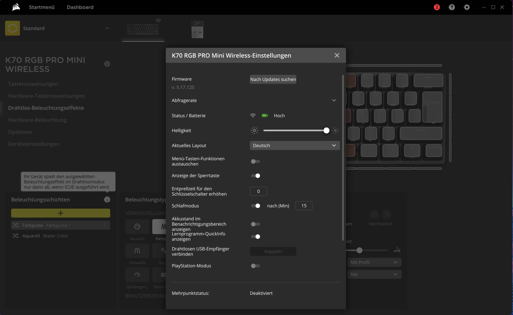 In den Geräteeinstellungen der Software führst du Firmware-Updates durch, änderst du Abfragerate und änderst beispielsweise die Einstellungen für den Schlafmodus. Standardmäßig schaltet sich die Tastatur im Wireless-Betrieb nach 15 Minuten Nichtnutzung aus.