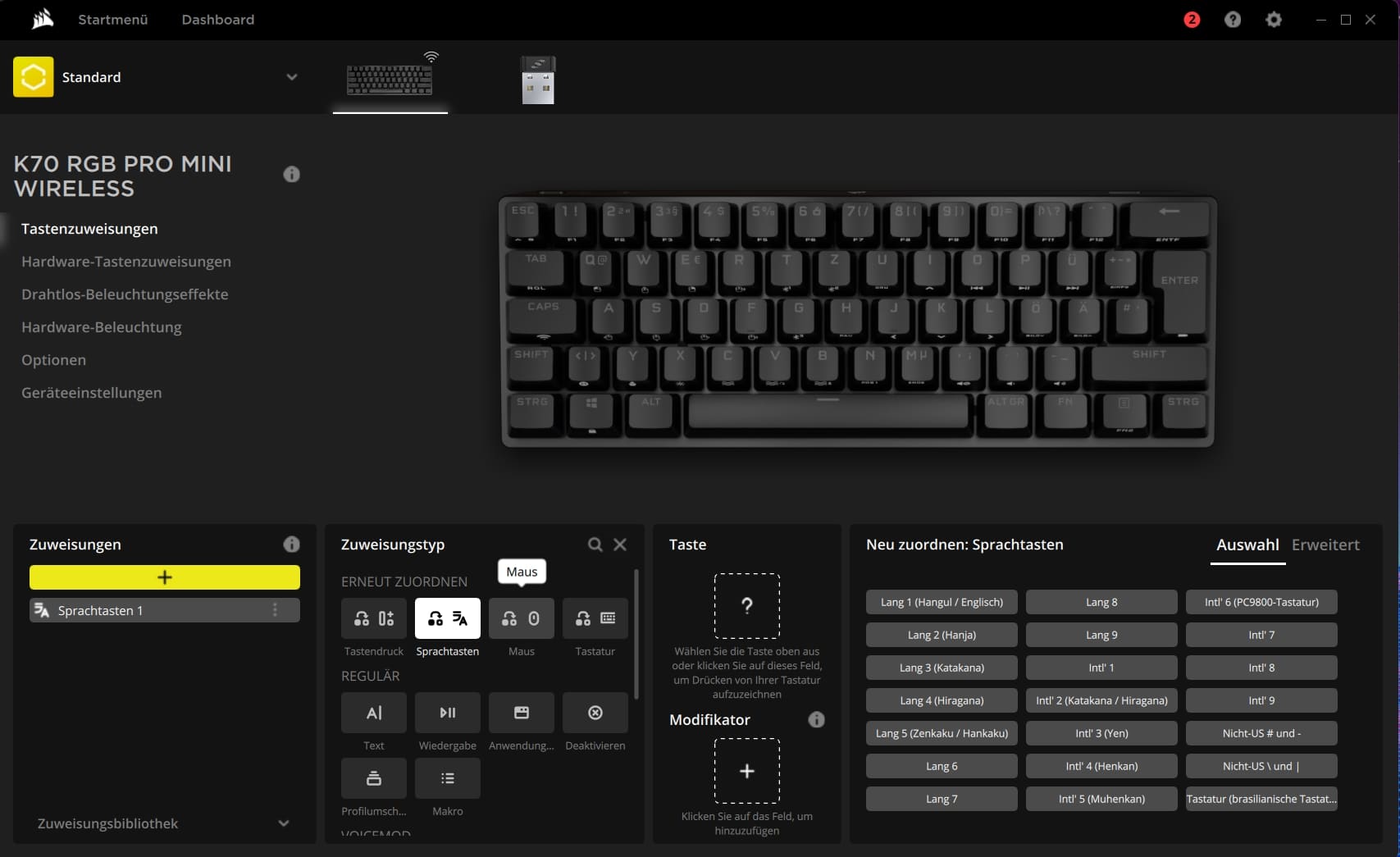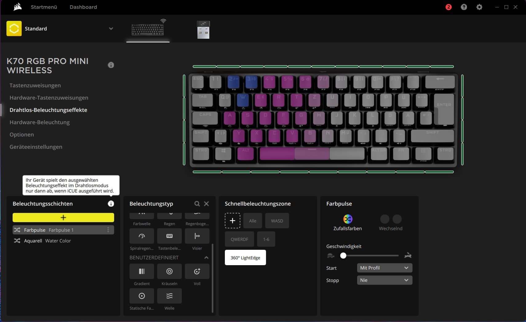 Als Begleit-Software kommt Corsairs hauseigene Lösung iCUE zum Einsatz, der hinsichtlich des Funktionsumfangs kaum eine andere Lösung das Wasser reichen kann. Hier kannst du beispielsweise die Beleuchtung bis ins kleinste Detail individualisieren und sogar eigene Effekte kreieren. Und das sogar für Wireless-Betrieb und kabelgebunden getrennt voneinander.