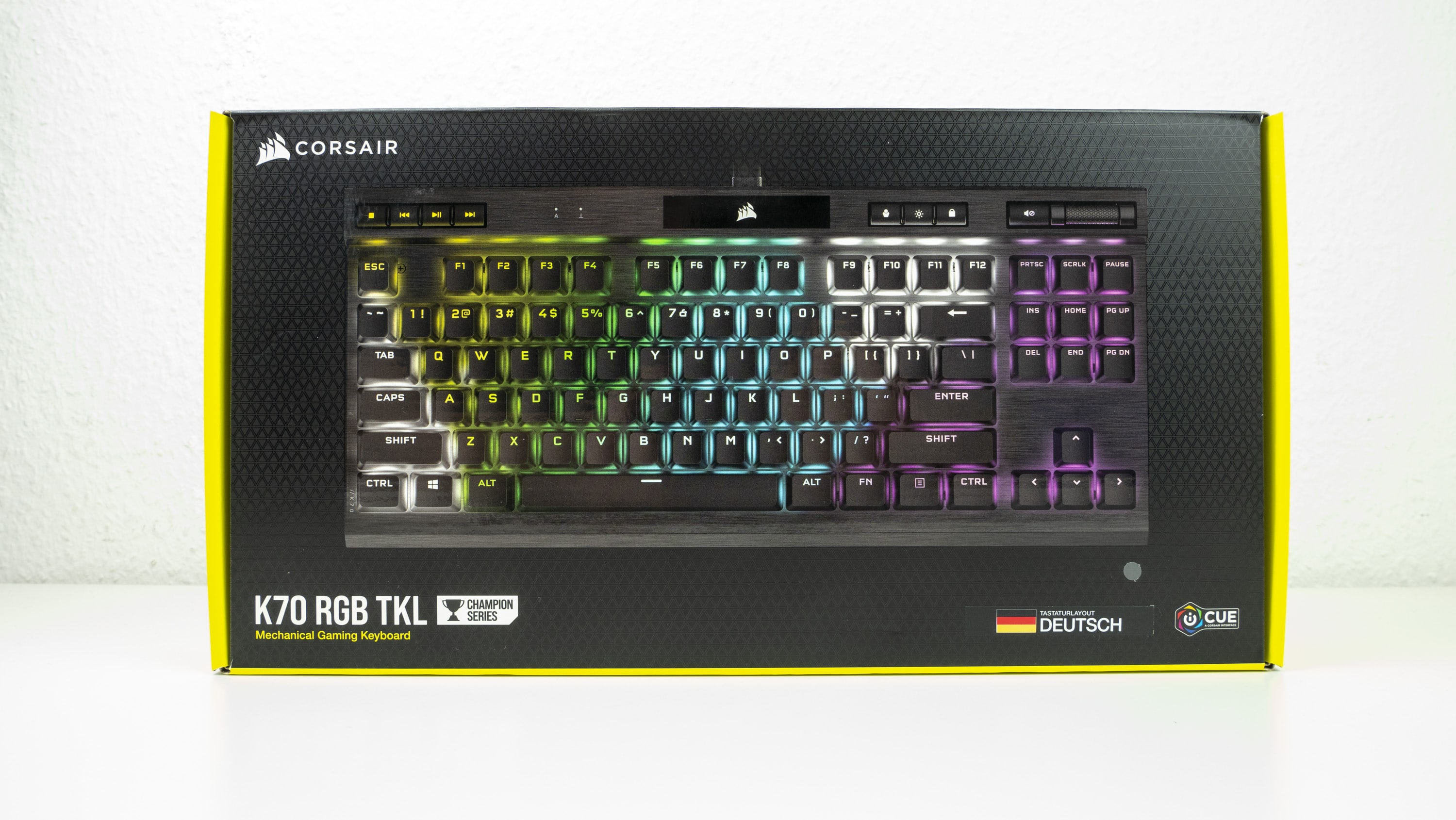 Erreicht hat uns die gewohnt gelb-schwarze Verpackung mit glänzender Darstellung der Tastatur auf der Vorderseite. An der Seite prangert der Slogan „Press the advantage“. Mal schauen, inwieweit die K70 RGB TKL von Corsair tatsächlich einen Vorteil bietet.