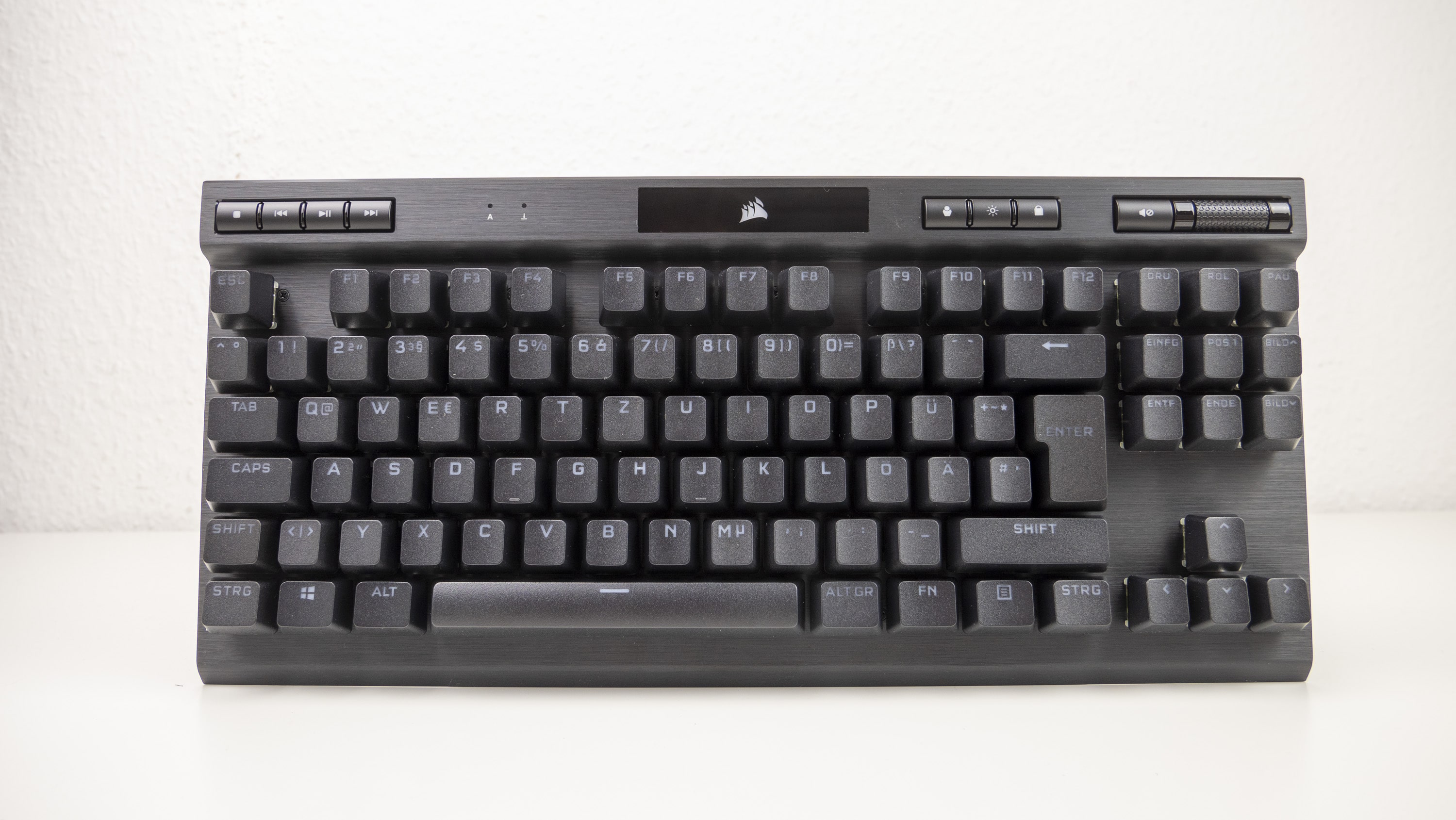 Die gesamte Oberfläche der K70 RGB TKL Champion Series ist aus Aluminium, was den Look aber natürlich auch die Robustheit fördert. Das Gehäuse darunter ist jedoch aus Kunststoff, ebenso wie alle acht Funktions- und Medientasten. Lediglich der Lautstärkenregler oben links ist aus glänzendem Aluminium gefertigt. Abgesehen davon ist alles in Matt gehalten; ebenso die Double-Shot-Tastenkappen, die an der Beschriftung durchleuchtend sind.