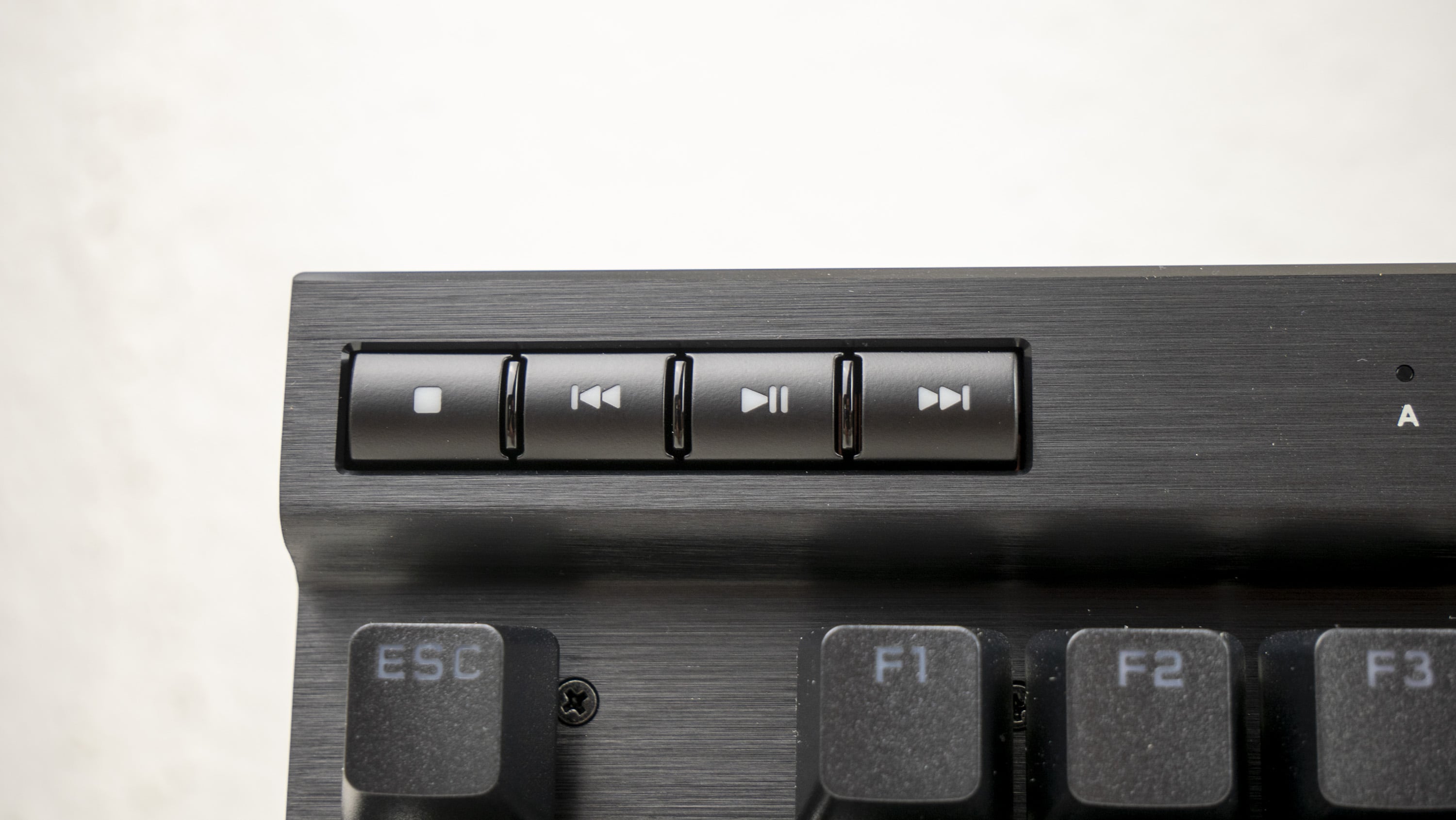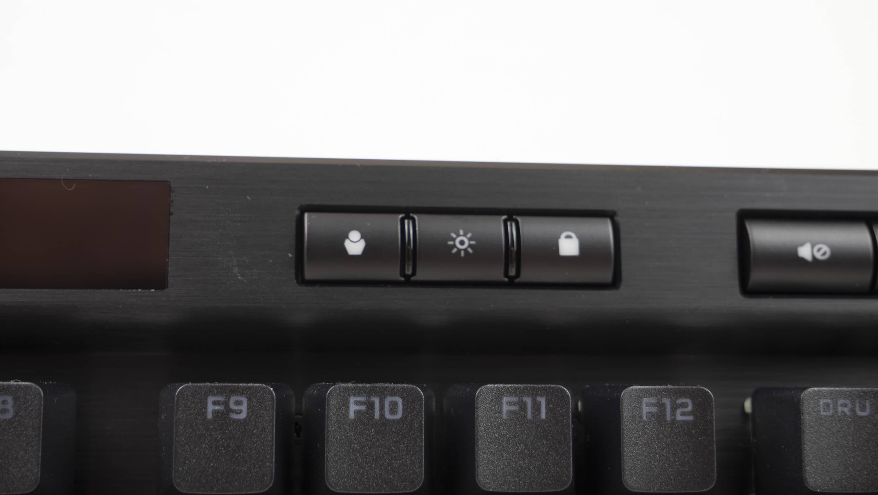 Links oben befinden sich vier Medientasten, welche Musik bzw. Videos starten, pausieren, stoppen und den Track wechseln können. Auf der rechten Seite befinden sich gruppiert drei weitere Tasten. Eine wechselt zwischen den on-board gespeicherten Profilen, die anderen beiden sind für die Helligkeit und Windows-Lock zuständig.