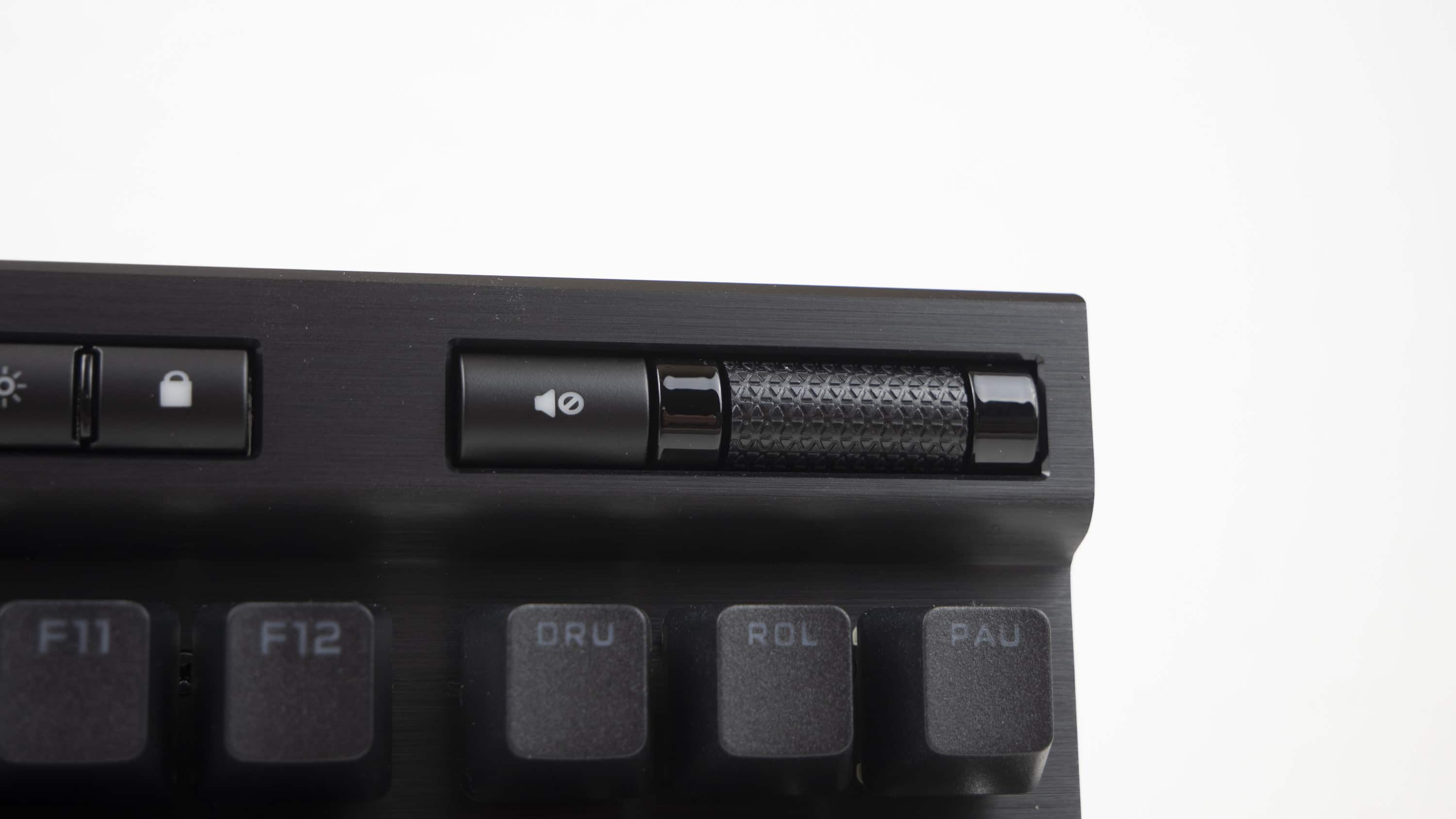 Darüber hinaus gesellen sich neben den drei rechten Tasten noch eine Mute-Taste sowie ein Lautstärken-Roller hinzu, dessen Bauweise wir schon von vorigen Corsair-Modellen kennen.