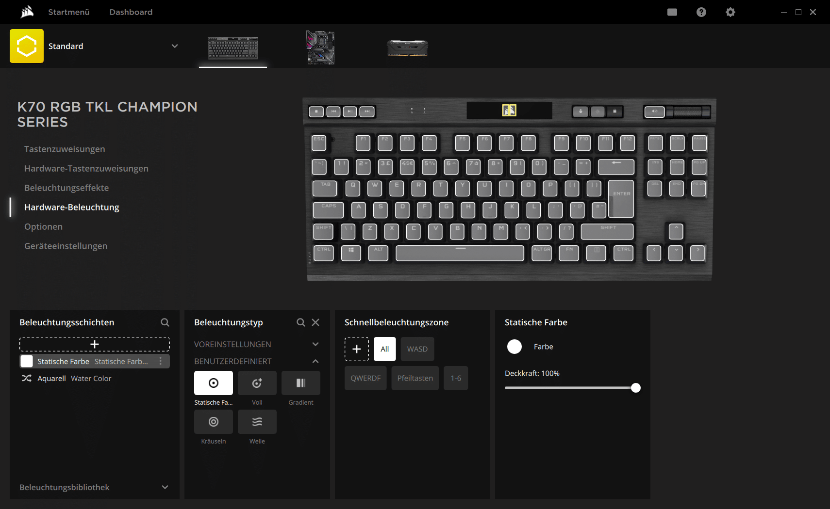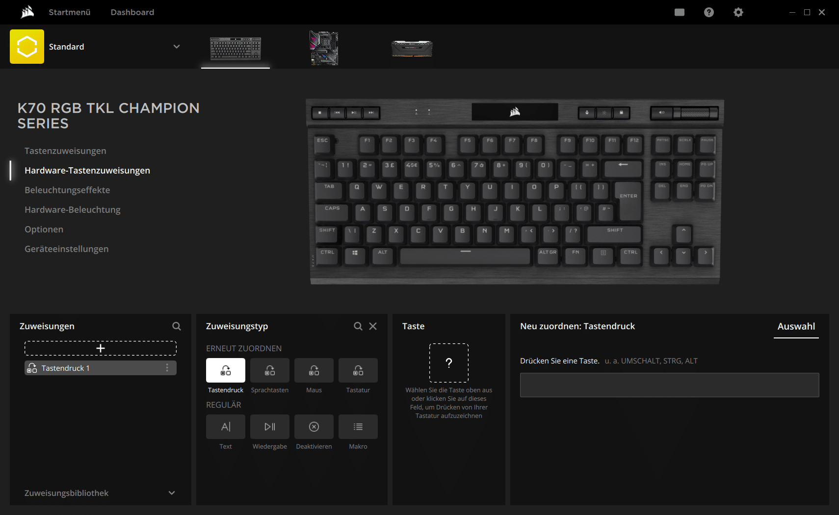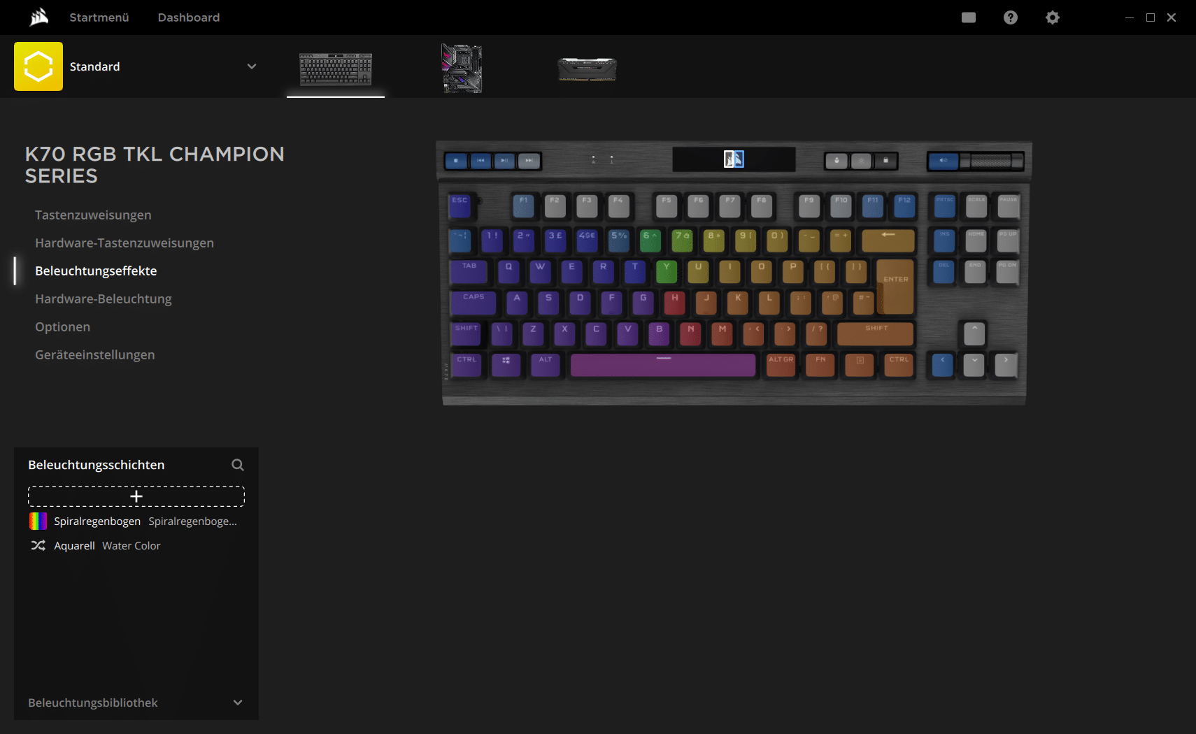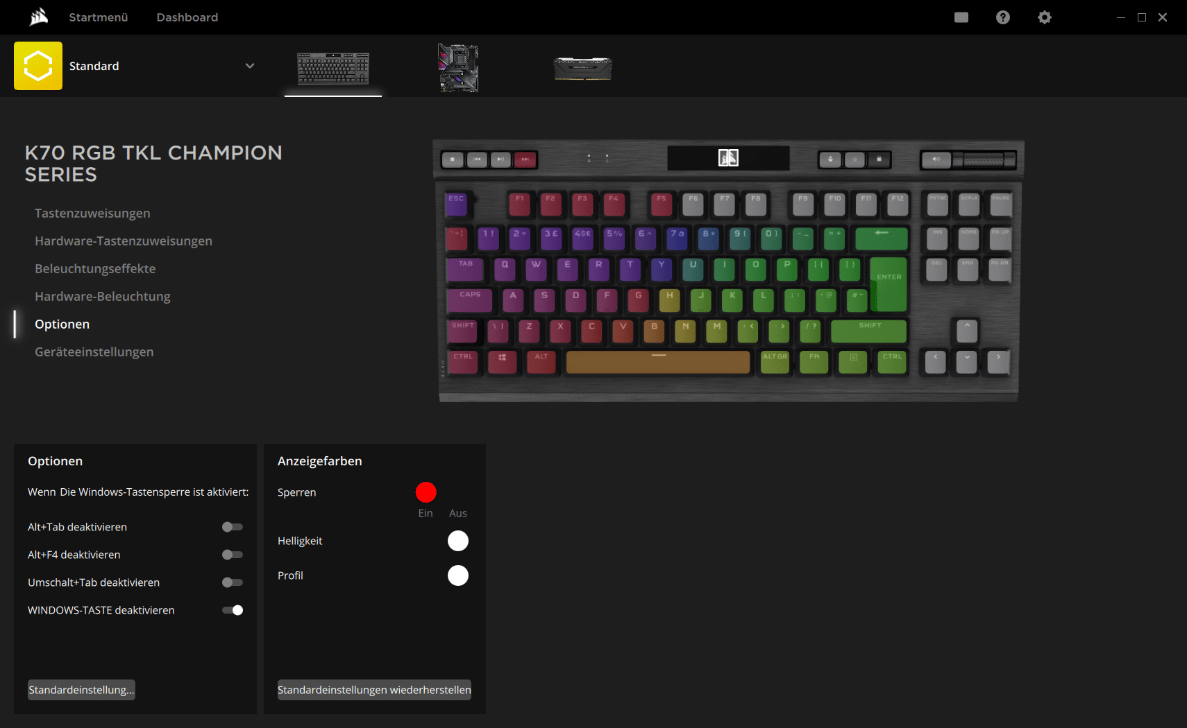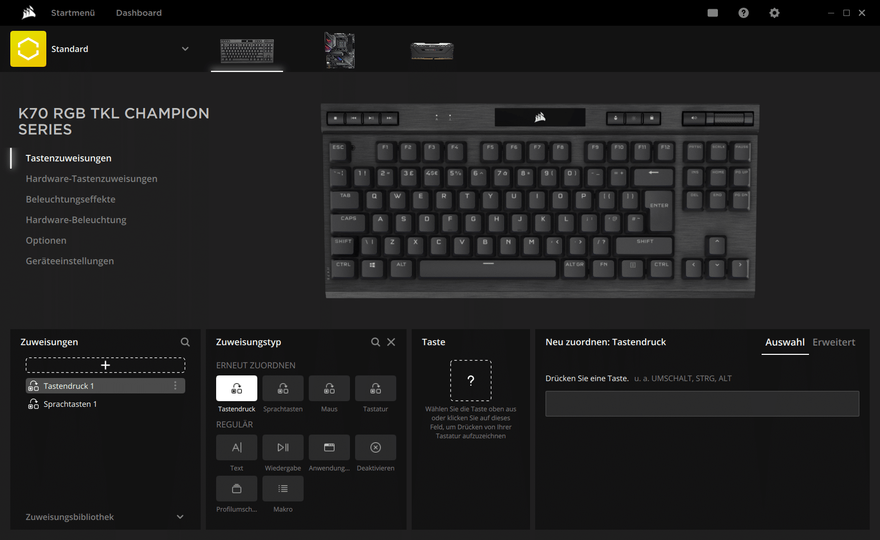 Selbstredend ist die K70 RGB TKL der Champion Series auch mit einem On-Board-Speicher ausgestattet. Es sind zwar nur 8 MB, aber die reichen immerhin für 50 Profile. Diese lassen sich ebenso wie Makros und die RGB-Beleuchtung in der Corsair-Software iCUE konfigurieren.